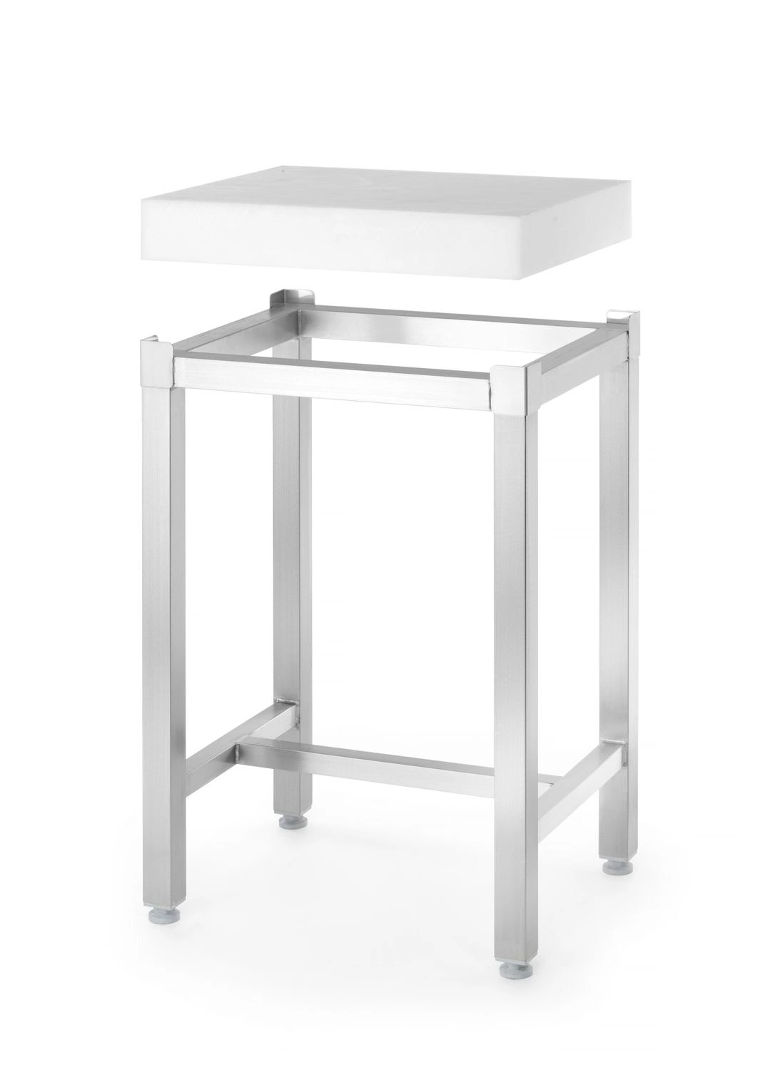 Řeznický špalek z polyethylenu se zesílenou základnou z nerezové oceli.