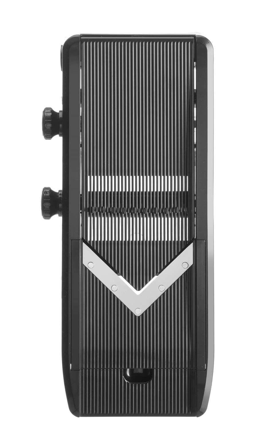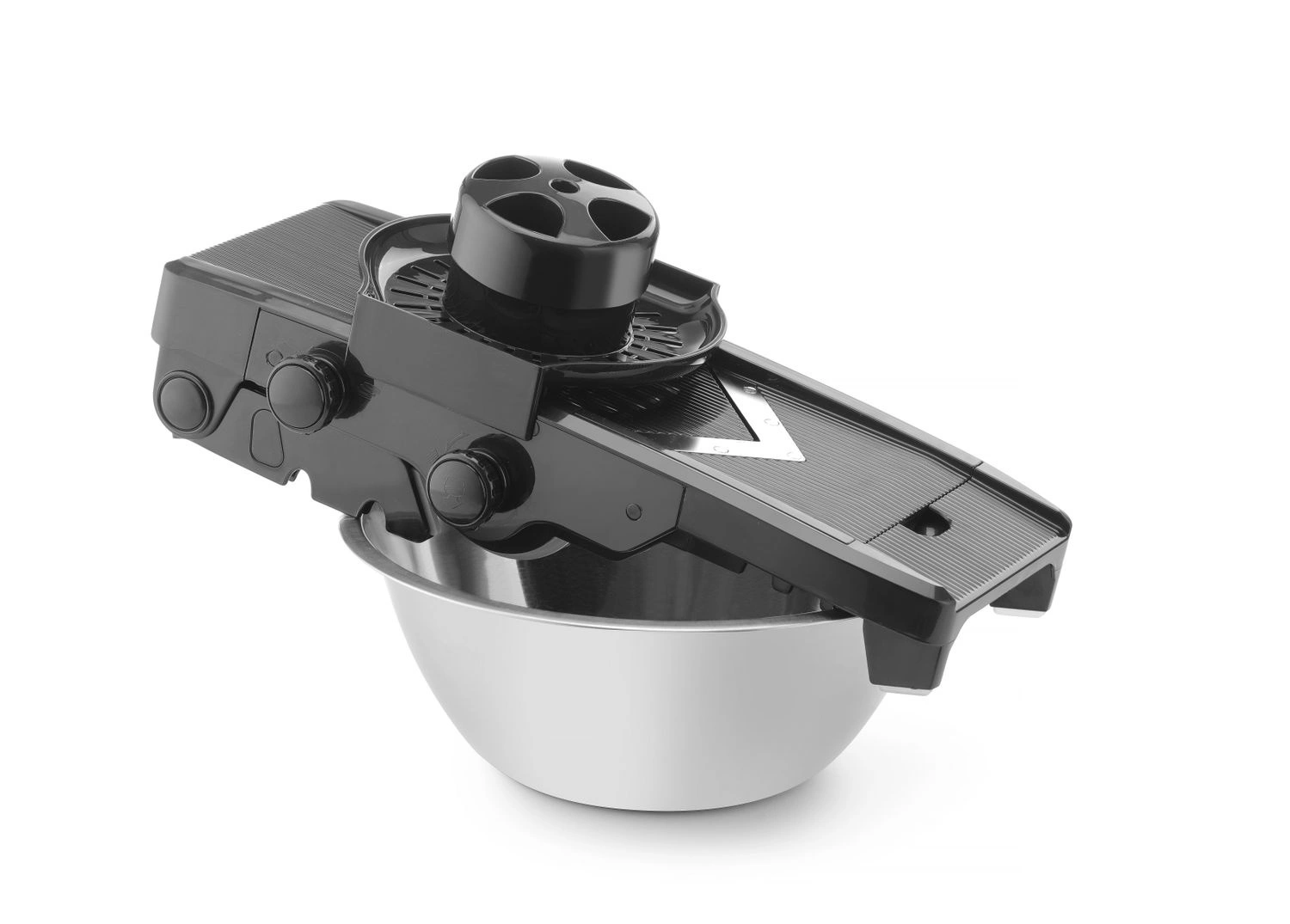 Ruční skartovačka na zeleninu z tvrdého plastu v černé barvě. Nože - nerezová ocel. Hlavní řezná čepel ve tvaru V. Součástí je 5 nástavců. Nastavitelná tloušťka plátkóu od 1 do 9 mm. Možnost dvou tloušťek sloupků 6 a 9 mm. Bezpečnostní upínací prvek s kovovými kolíky pro zajištění zeleniny.