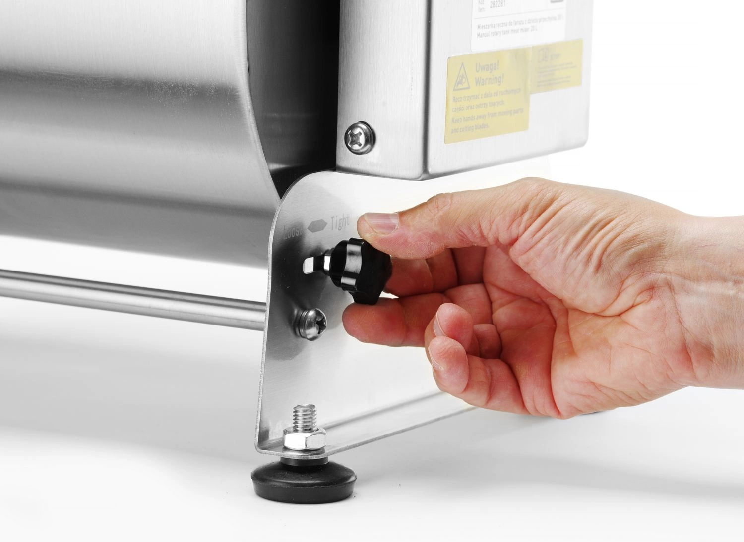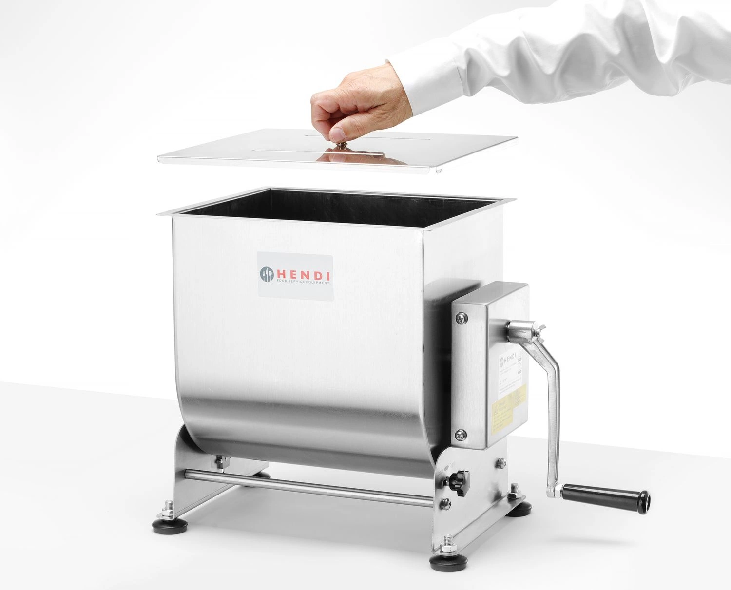 Ruční mixér na maso s objemem 20 litrů. . Je vyroben z nerezové oceli AISI 304 a je ideální pro malou výrobu uzenin. Kompletní demontáž mísy a míchadla umožňuje důkladné a rychlé čištění. Rukojeť je vyrobena z litého hliníku. Výklopná mísa s bezpečnostní pojistkou usnadňuje vyjmutí hotové nádivky. 3 otočení kliky rónují jedno otočení míchadla v míse.