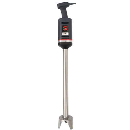 Ruční mixér s míchacím ramenem XM-72 od společnosti Sammic. . Kryt motoru je vyroben ze dvou typů plastu. Nó¿ se třemi lopatkami, vyrobenými z kalené nerezové oceli. Kryt nožů o průměru 123 mm. Vhodný pro míchání široké škály výrobkůóv nádobách o objemu až 250 l. Maximální značka ponoru. Přídržná část pokrytá protiskluzovým materiálem, Pevné otáčky 12 000 ot/min,