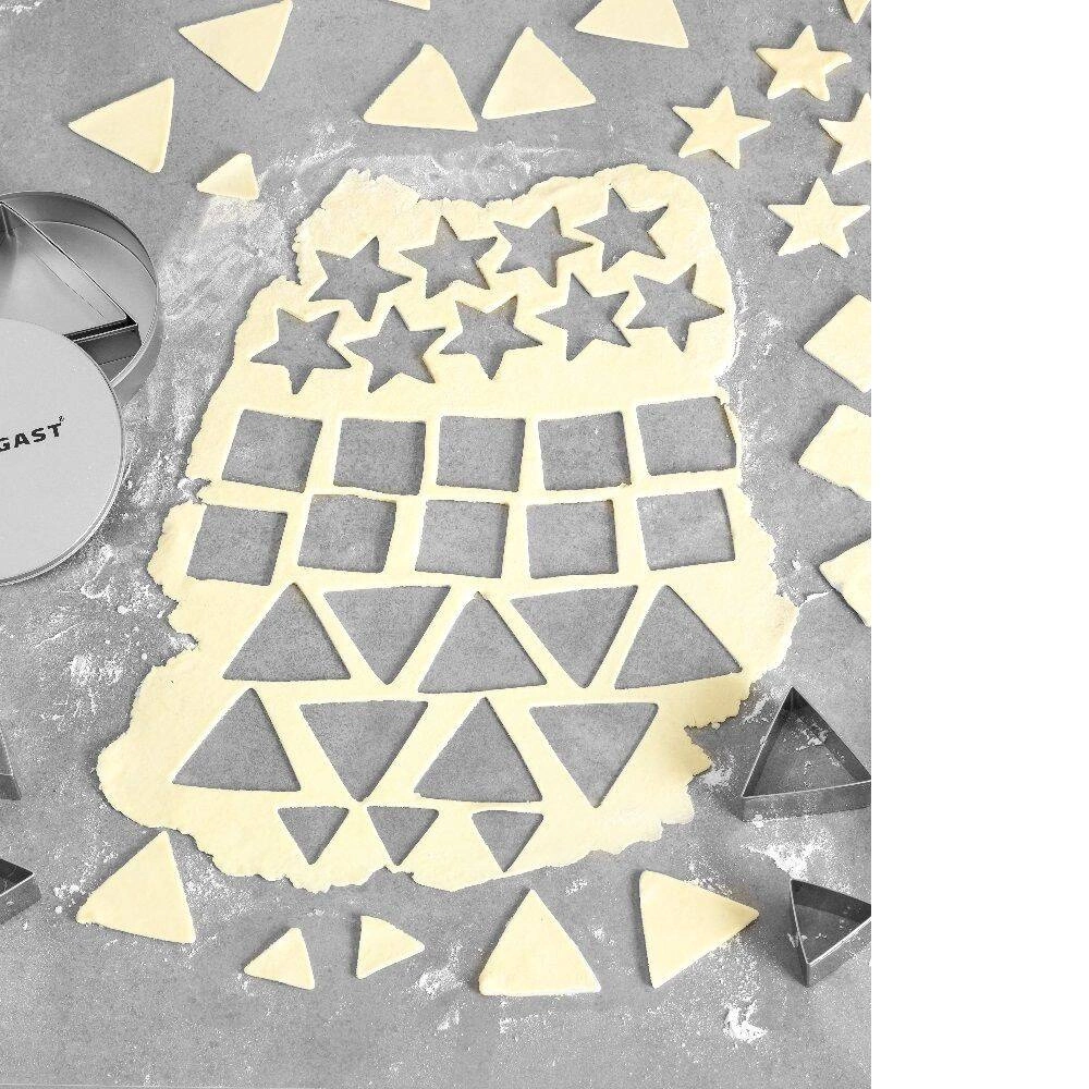 Vykrajovátka mají tvar hvězdy a výšku 3 cm, což je činí vhodnými jak pro tenké sušenky, tak i pro silnější pečivo. Taková konstrukce umožňuje jejich volné použití pro různé druhy těst, cukrových hmot nebo perníčků, stejně jako pro vykrajování dekorací z marcipánu nebo fondánu. Výška vykrajovátek zaručuje, že vykrojené tvary budou mít estetické, výrazné okraje, což je obzvláště důležité při zdobení dortů a zákusků v profesionálních cukrárnách.