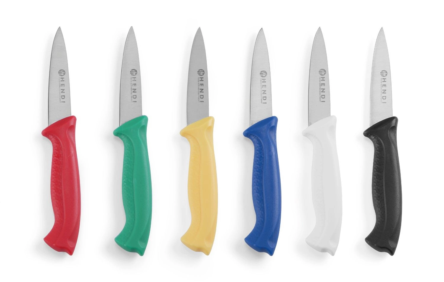 Zsada loupacích nožů HACCP s délkou čepele 9 cm. . Sada 6 kusů v barvách: bílá, červená, modrá, zelená, černá, žlutá. Vyrobeno z válcované oceli.