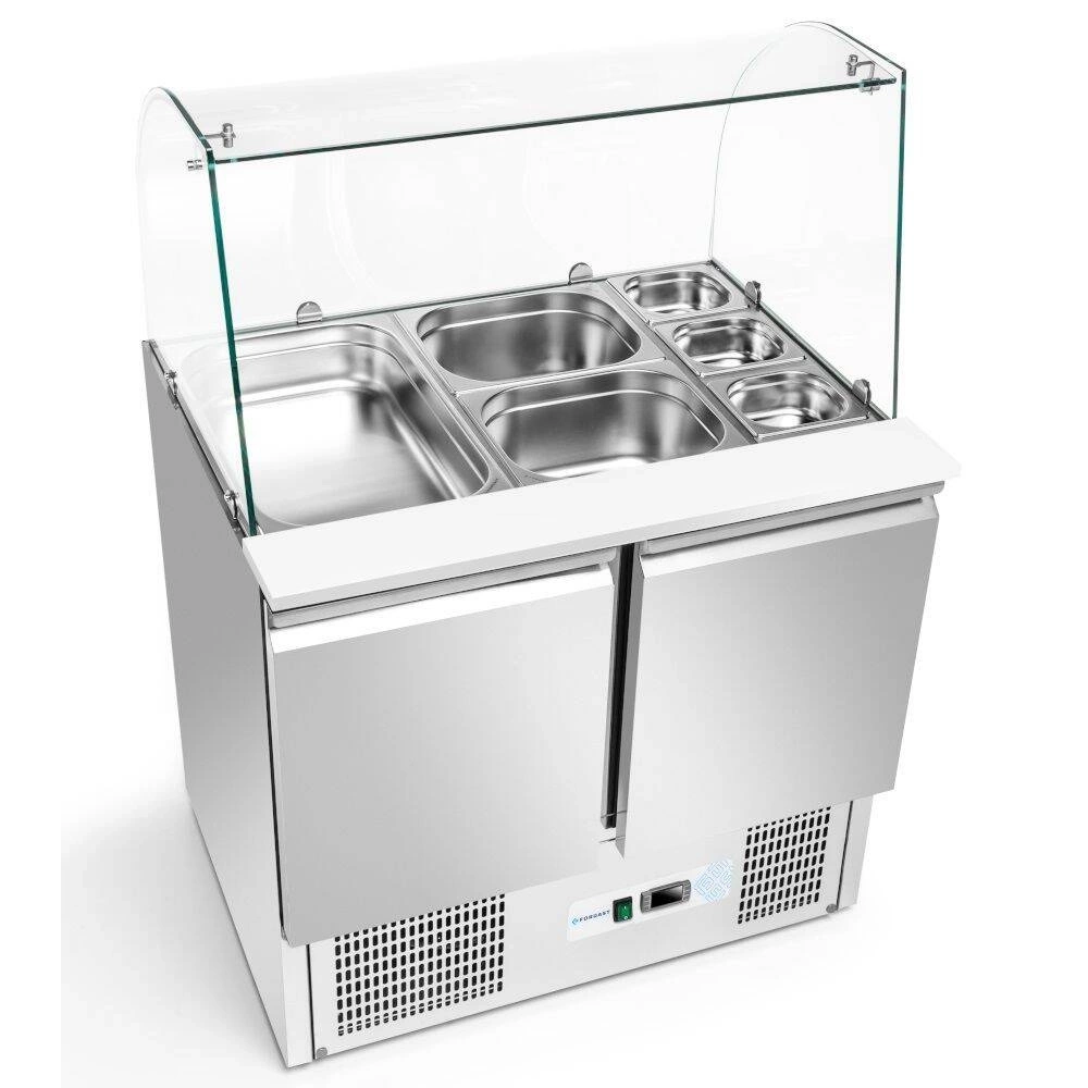 - Estetika a funkčnost: Ohýbané čelní sklo a boční prvky vytvářejí estetickou ochrannou bariéru a zároveň umožňují plnou prezentaci produktů na chladicím stole.