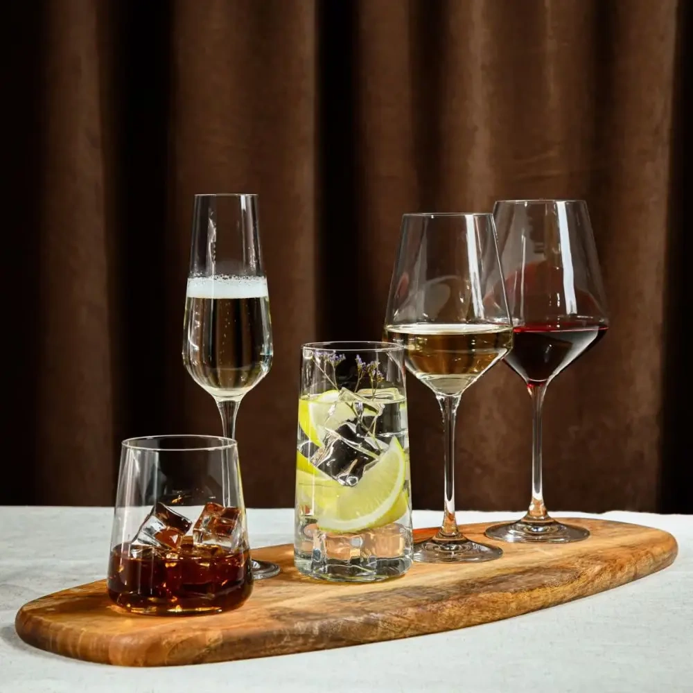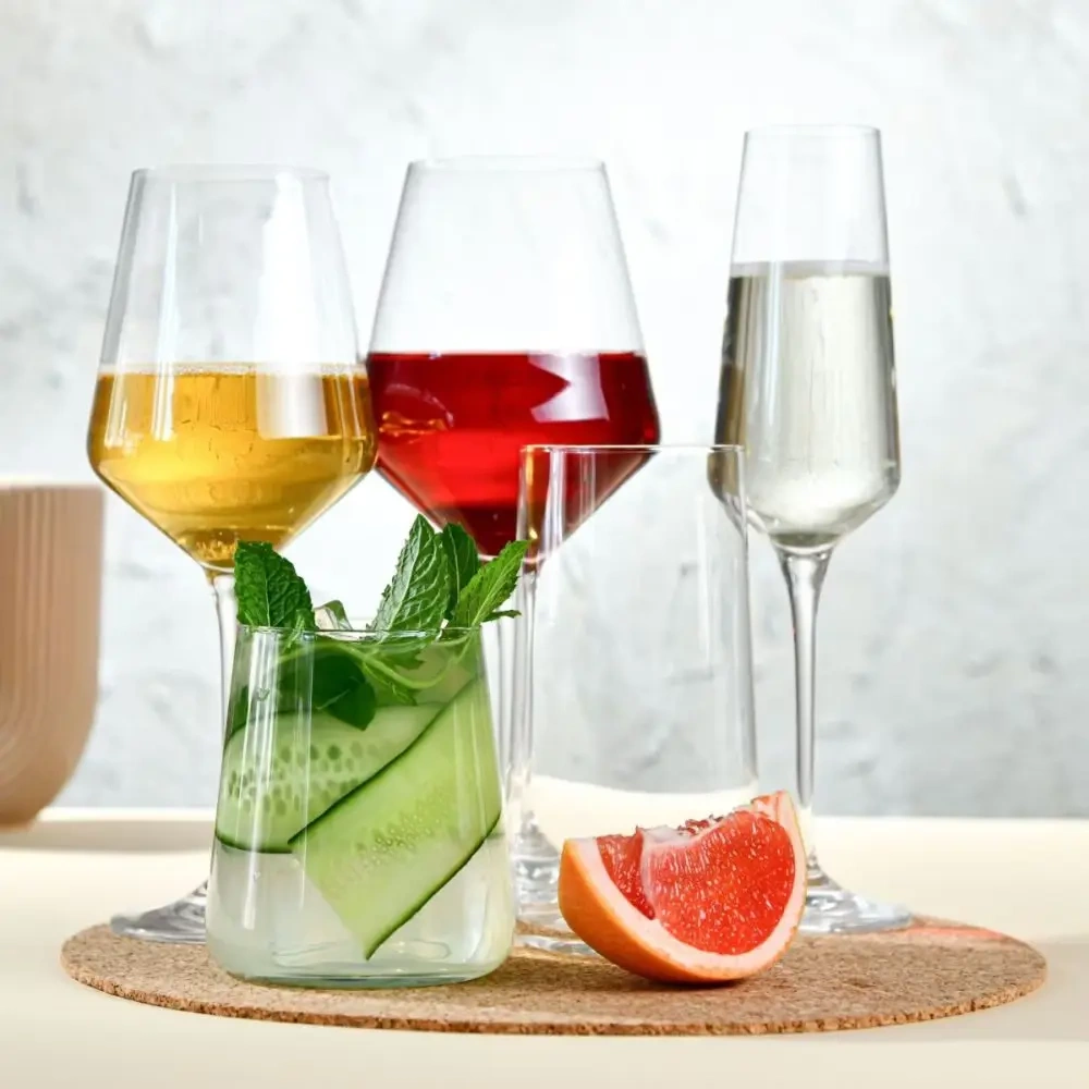 • Multifunkčnost: Sada obsahuje sklenice na červené i bílé víno, sklenky na šampaňské a vysoké i nízké sklenice, takže můžete podávat širokou škálu nápojů – od vín a šampaňského po koktejly i nealkoholické nápoje.