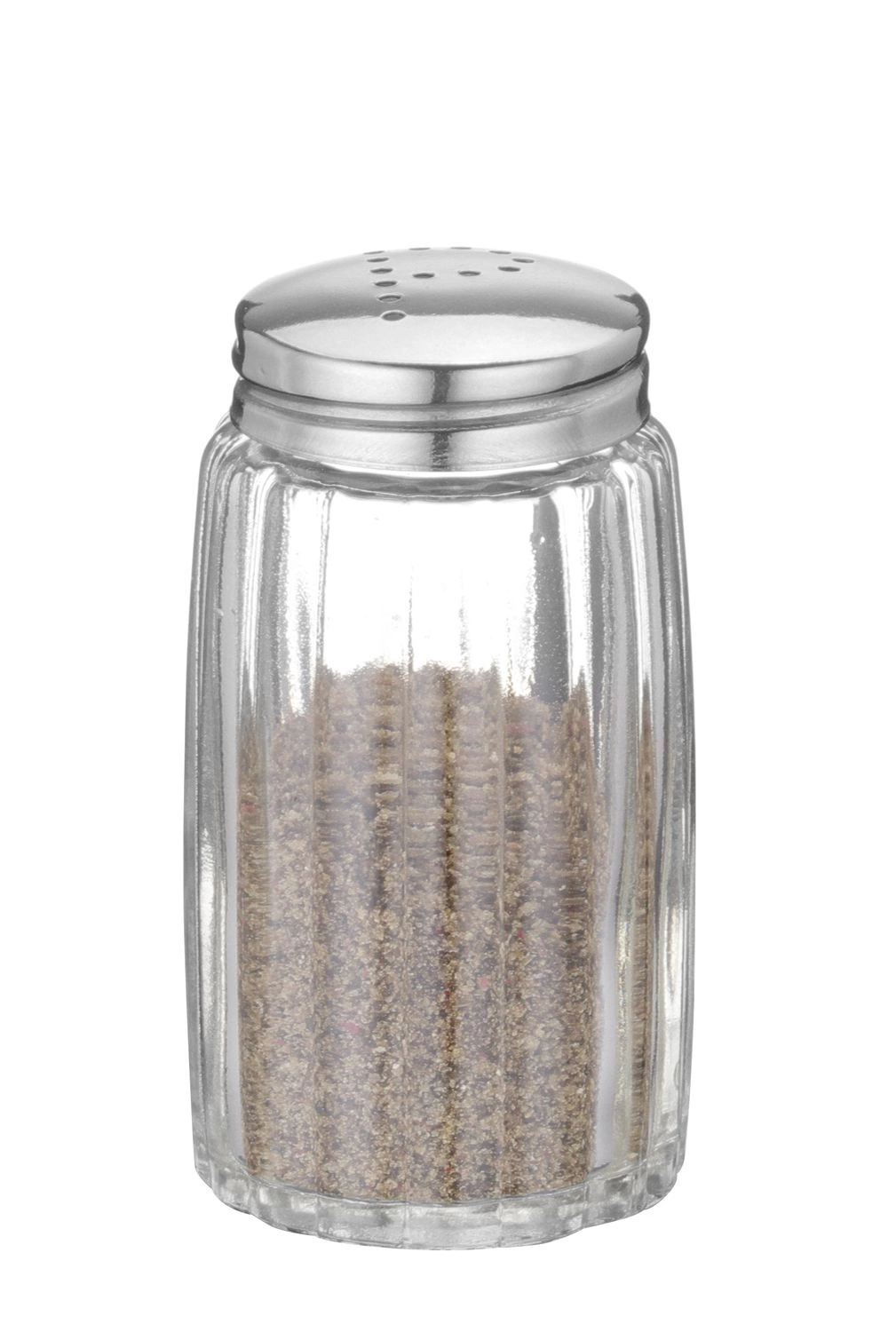 Skleněný šejkr na pepř s víkem z nerezové oceli.