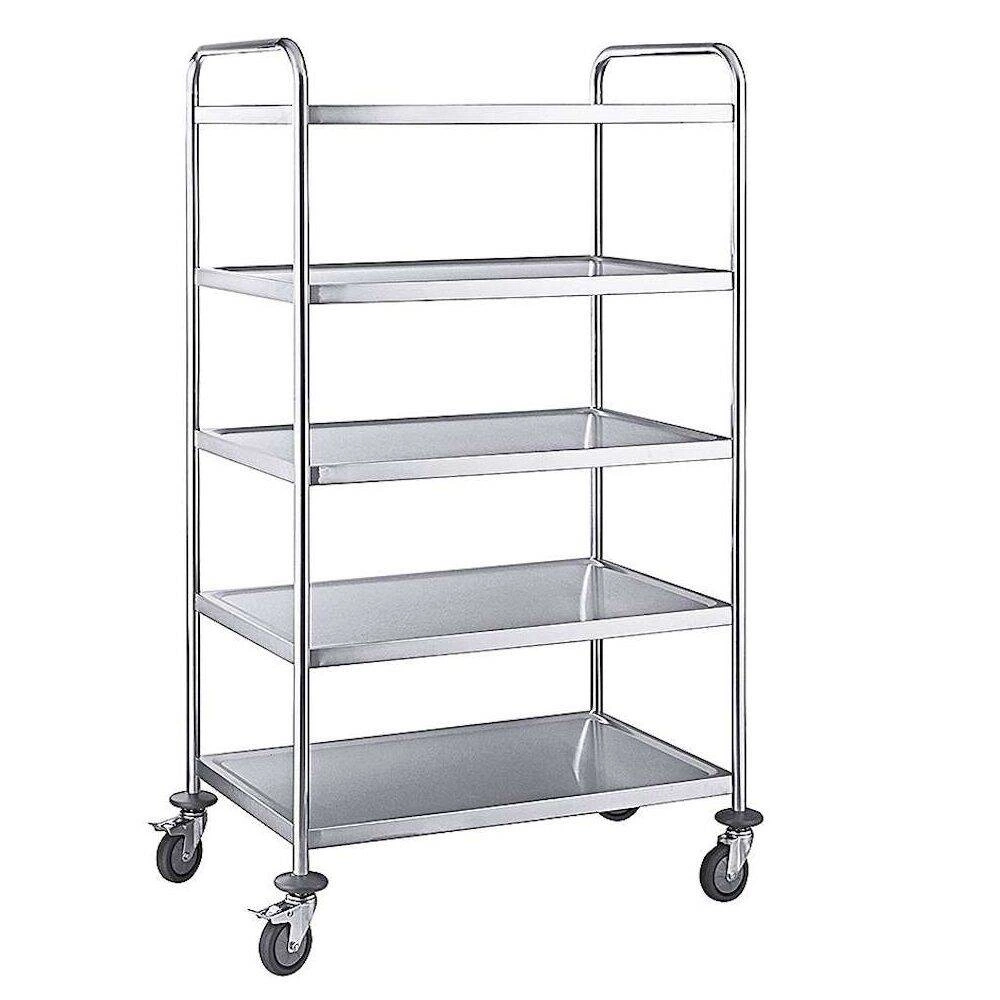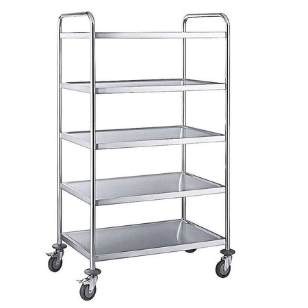 Číšnický vozík s 5 policemi z nerezové oceli je profesionální nástroj pro přepravu nádobí, pokrmů nebo gastronomických doplňků v restauracích, hotelech a dalších provozovnách. Vyznačuje se pevnou konstrukcí, velkou kapacitou a snadným manévrováním, díky čemuž se ideálně hodí do intenzivně využívaných prostor.