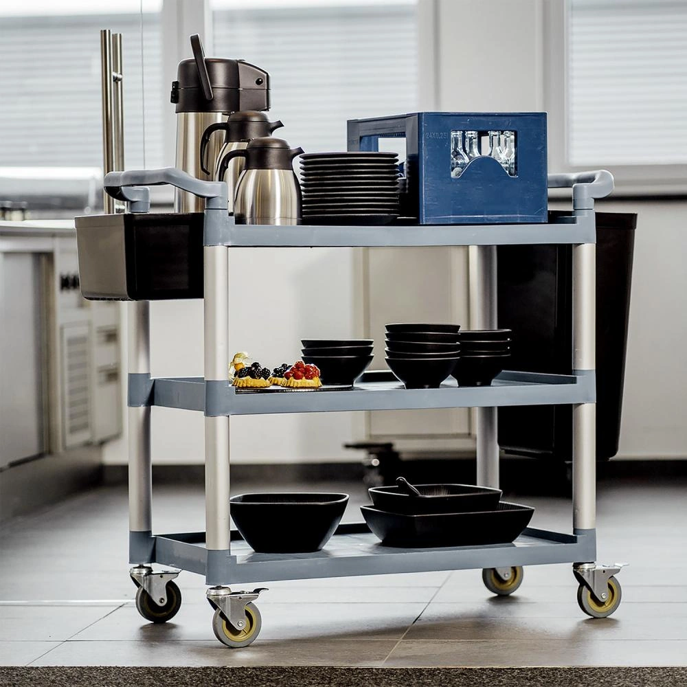 Číšnický vozík READY, 3policový z plastu APS 11945 je profesionální zařízení navržené pro efektivní servírování a přepravu nádobí, pokrmů či jiných potřeb v gastronomických provozech. Odolná konstrukce z hliníku a polypropylenu, tři prostorné police a čtyři kolečka s brzdami činí tento vozík mimořádně praktickým řešením jak pro restaurace, hotely, tak i cateringová zařízení.