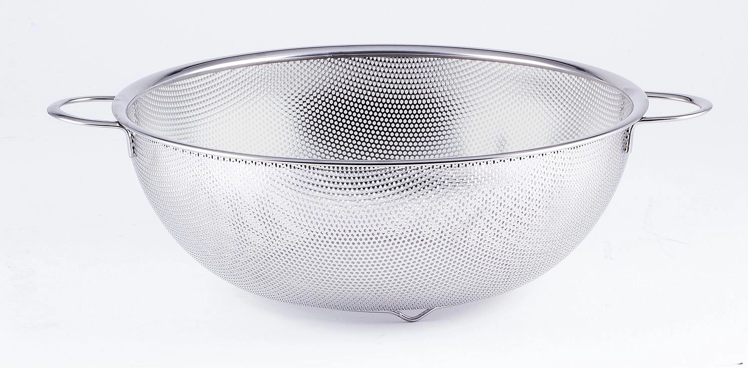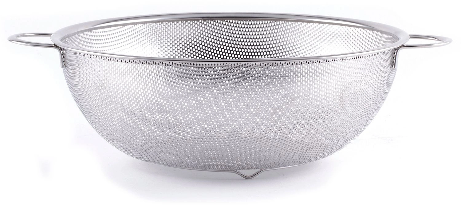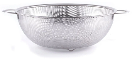 Sítko o průměru 31,5 cm se 2 držadly a podstavcem. Vyrobeno z nerezové oceli. Lze mýt v myčce nádobí.