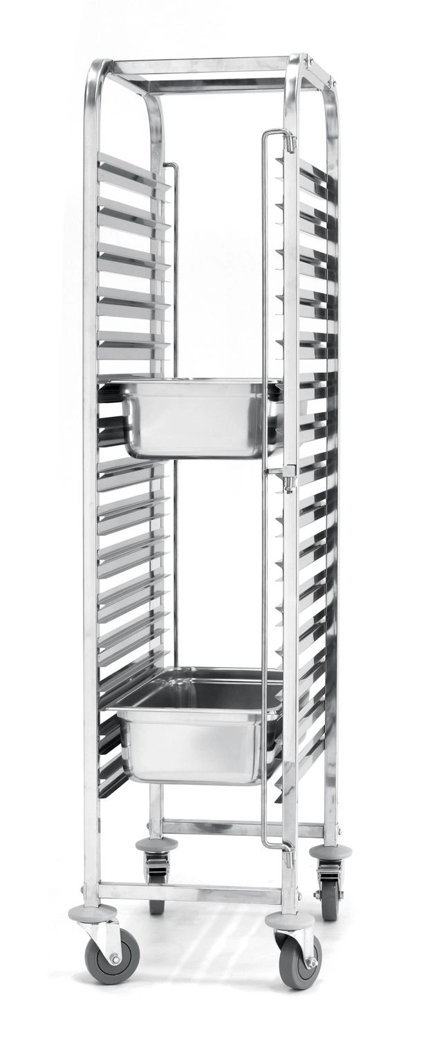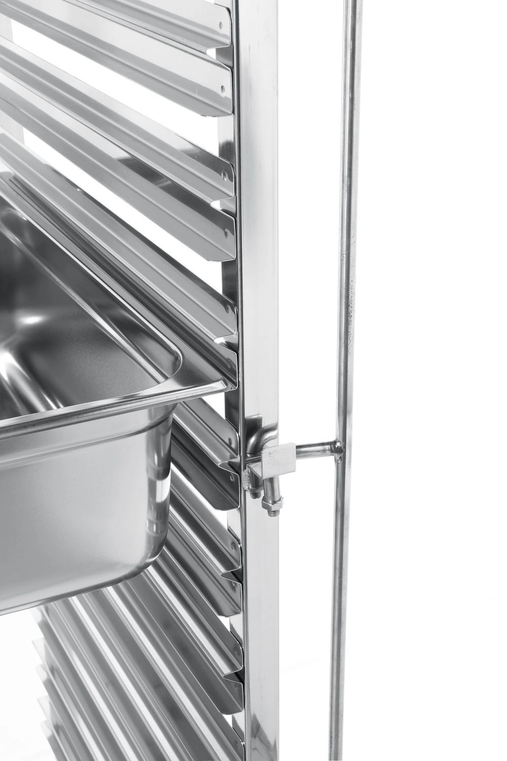 Wózek z chromované oceli pro přepravu zásobníků a kontejnerů GN. Vozík vyžaduje vlastní montáž. 4 otočná kolečka (2 s brzdou). GN kontejnery jsou chráněny proti vypadnutí na obou stranách. Kapacita 15 GN 1/1.
