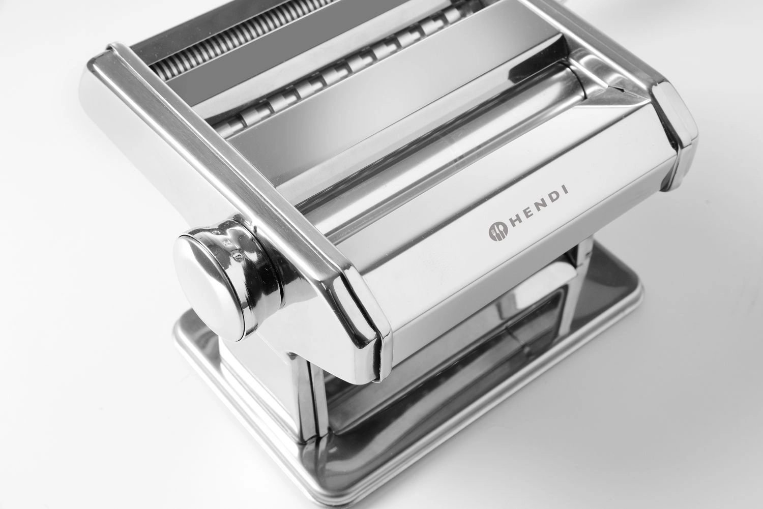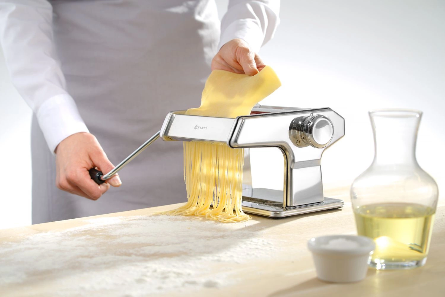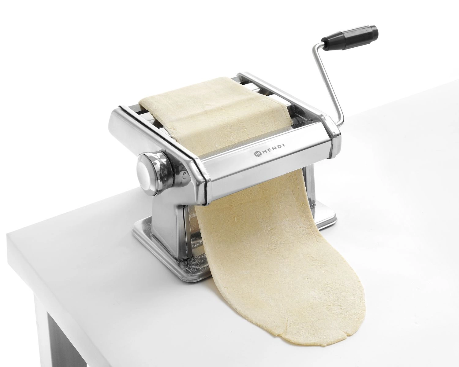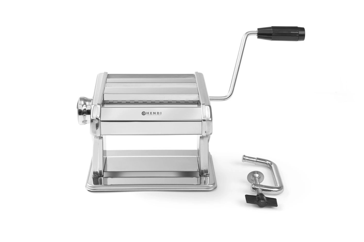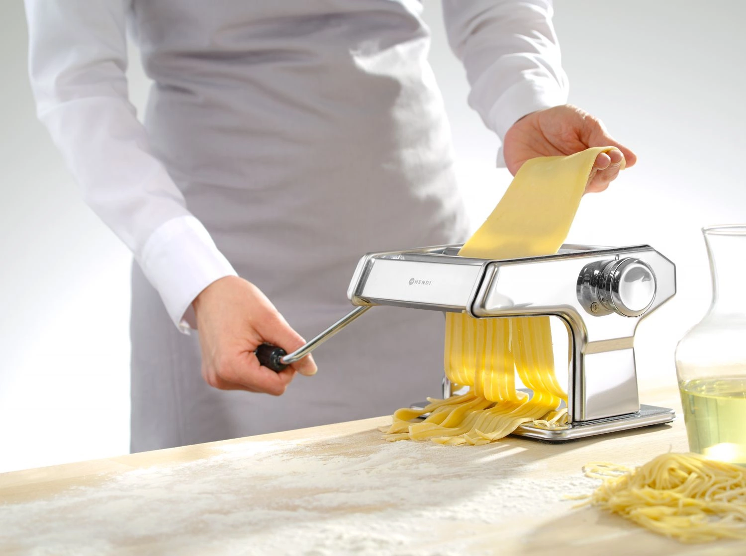 Stroj na těstoviny. . Ideální pro přípravu čerstvých těstovin (maximální šířka těsta 14 cm). Knoflík pro nastavení tloušťky těsta v 7 krocích od 0,2 do 2,5 mm. Tři válečky/čepele z hliníkové slitiny: pro válení těsta, těstovin tagliatelle a fettuccine. Má klikovou rukojeť a držák pro upevnění na stůl.