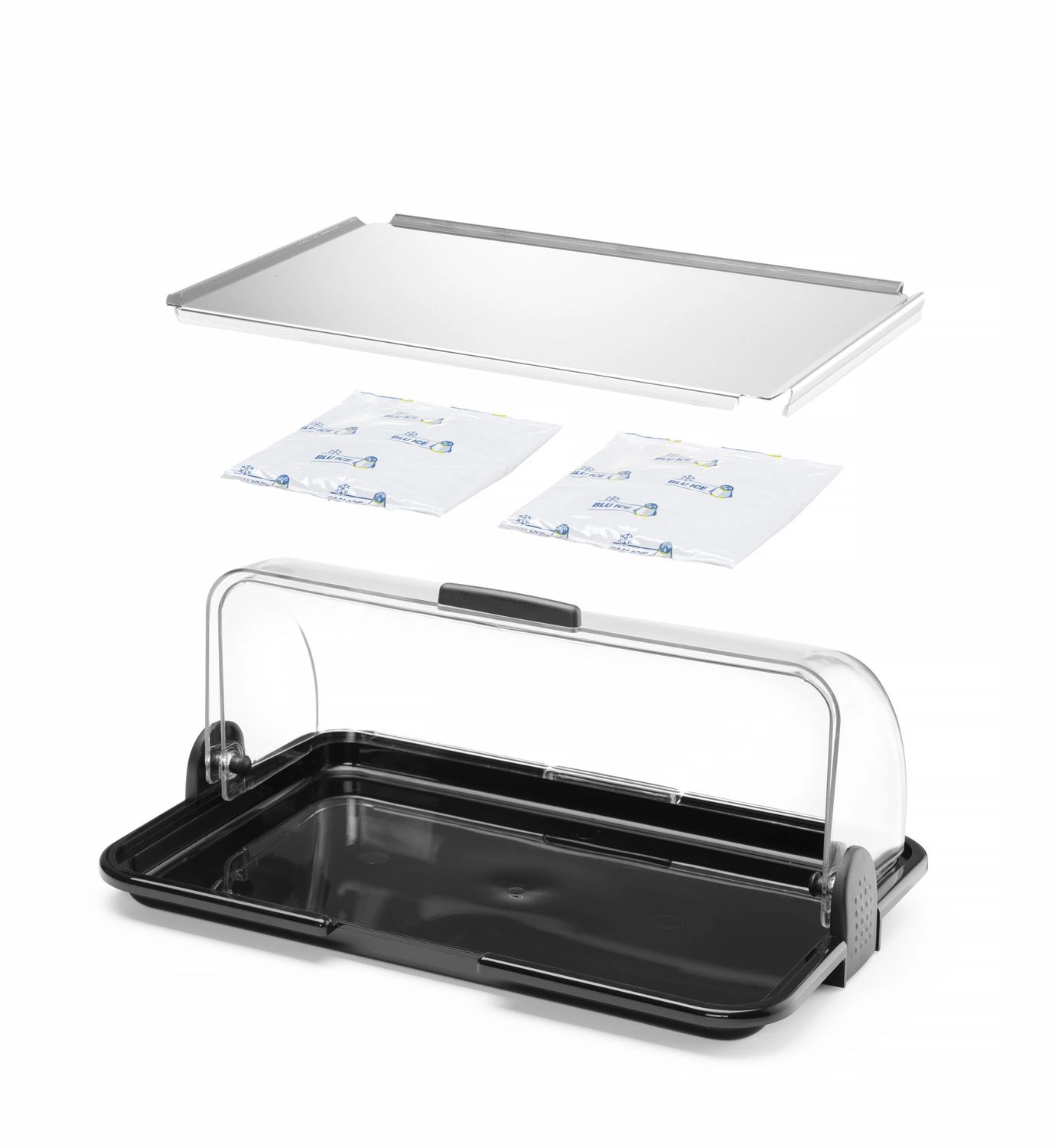 Lze mýt v myčce nádobí. Součástí jsou 2 gelové kazety pro chlazení nebo ohřívání potravin umístěných ve vitríně.
