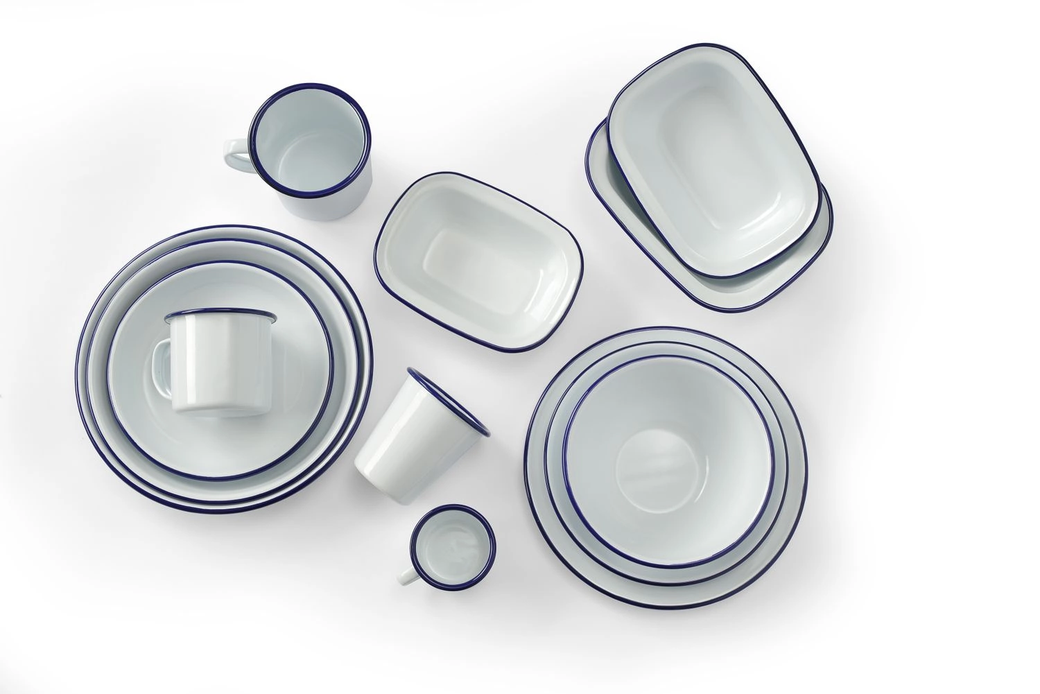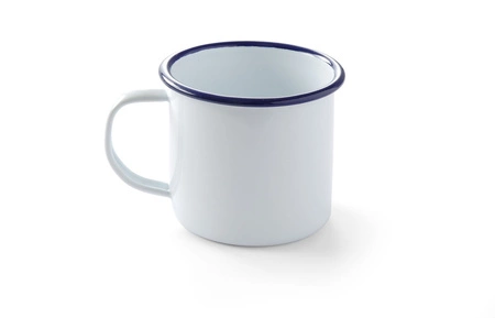 Hrnek s uchem o objemu 360 ml. Vyrobeno z vysoce kvalitní oceli potažené bílým smaltem s modrým okrajem. Lze stohovat, lze mýt v myčce nádobí. Nepoužívejte v mikrovlnné troubě.