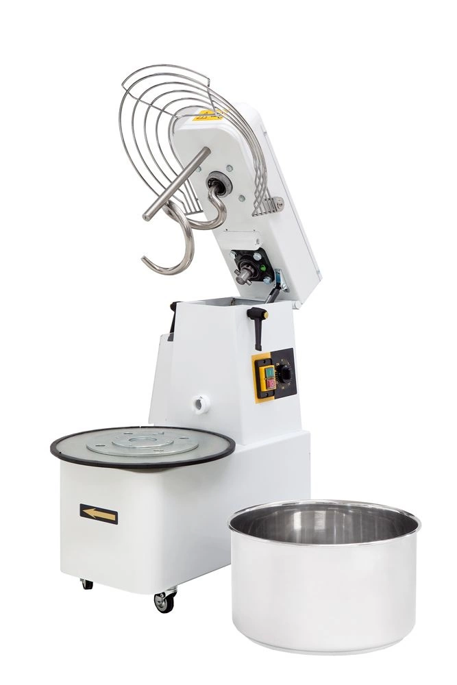 Spirálový mixér s odnímatelnou mísou s objemem 22 litrů a zvedání hlavy. 2 rychlosti. Mixér je ideální pro pizzerie, cukrárny a pekárny. Pouzdro z vysoce kvalitní bíle lakované oceli. Mísa, bezpečnostní víko, spirála z nerezové oceli 18/10. Tichý chod olejového převodu. Mixér má: tlačítko pro změnu rychlosti (2 rychlosti), mikrospínač bezpečnostního víka a vestavěný časovač.