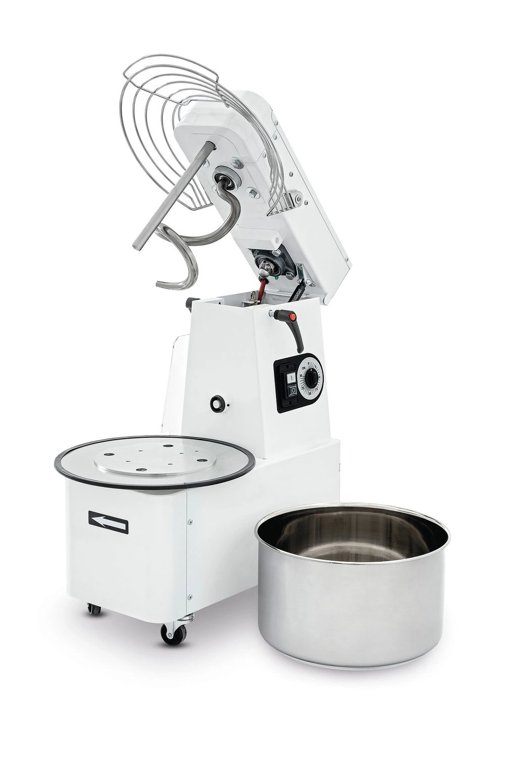 Spirálový mixér s odnímatelnou mísou značky Prismafood Ideální pro pizzerie, cukrárny, pekárny. Pouzdro z vysoce kvalitní bíle lakované oceli. Mísa o objemu 22 litrů, bezpečnostní víko, spirála z nerezové oceli 18/10. Zvedací hlava a odnímatelná mísa. Mikrospínač pro bezpečnostní víko. Tichý chod olejové převodovky. Časovač a bezpečnostní dvoustupňový spínač. Vybaveno 4 kócky, z toho 2 s brzdou. Stroj má výkon 56 kg/h. Maximální kapacita těsta je 17 kg. Mísa má průměr 36 cm a je vysoká 21 cm.