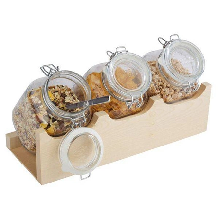 Stojan se sklenicemi GOOD MORNING javor APS 13965 byl navržen s ohledem na profesionální hotelové bufety, restaurace i domácí kuchyně, kde je důležitá estetika a funkčnost. Pevná javorová základna poskytuje stabilitu a skleněné sklenice umožňují pohodlné skladování potravin. Každá sklenice má široký otvor, což usnadňuje přístup k obsahu a čištění. Díky průhledné formě uživatel ihned vidí, co je uvnitř, a potraviny jsou vždy po ruce.