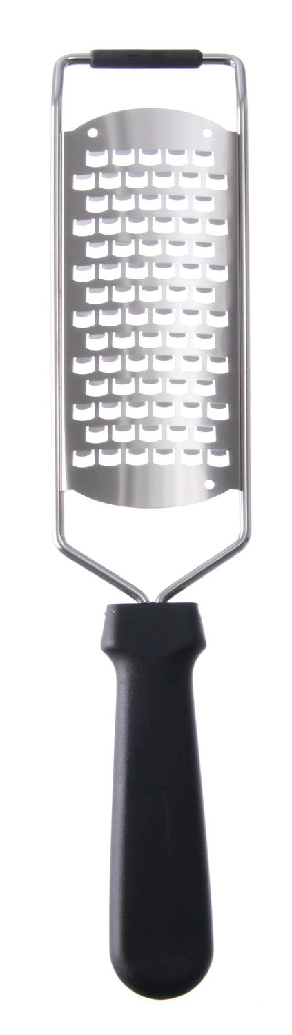 Široké ruční struhadlo se středními oky Na konci je protiskluzová gumička, která usnadňuje práci. Vyrobeno z nerezové oceli (struhadlo) a plastu (rukojeť).