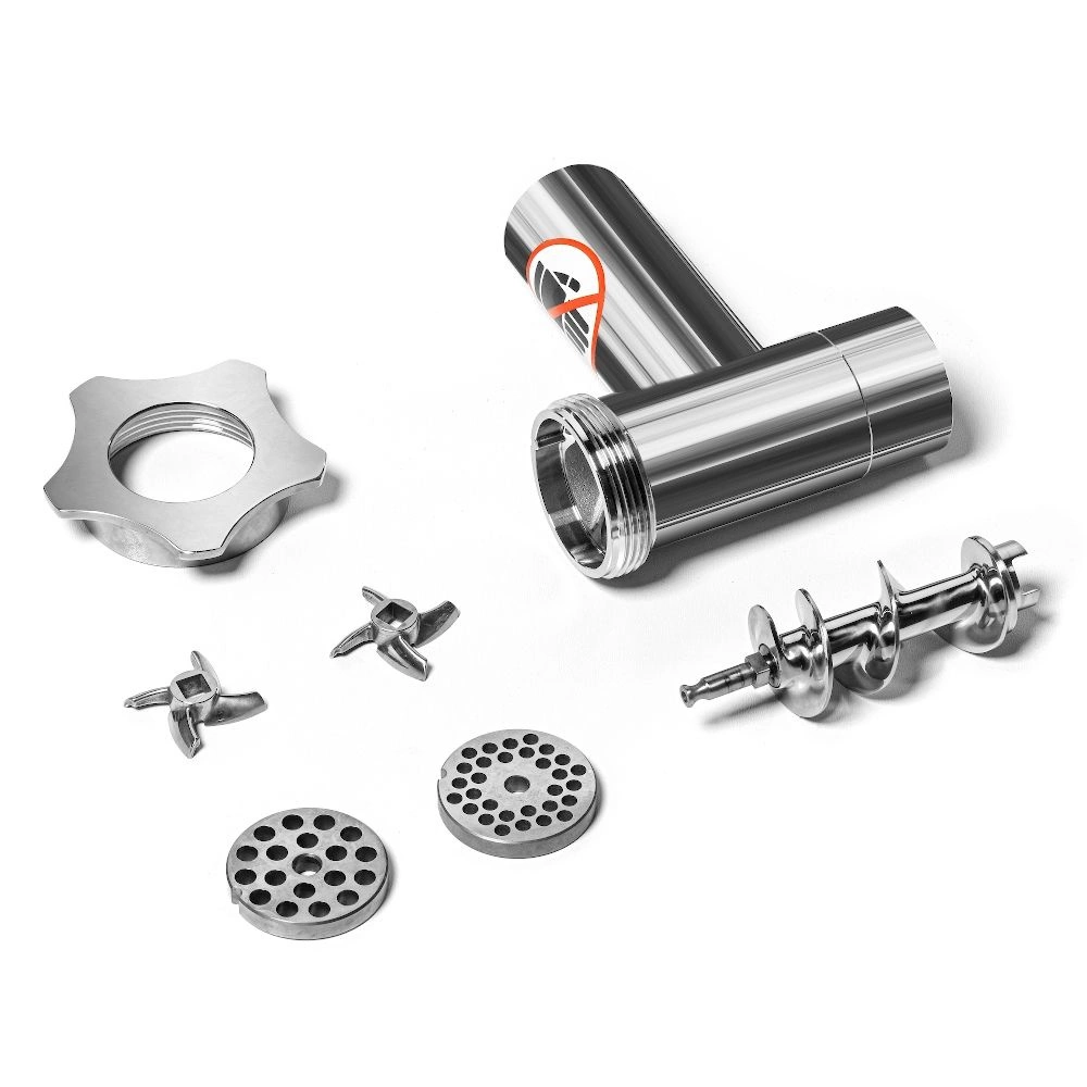 Zařízení je kompletně vyrobeno z vysoce kvalitní nerezové oceli, což zaručuje nejen odolnost proti mechanickému poškození, ale také usnadňuje údržbu čistoty a splnění hygienických požadavků. Součástí balení jsou dvě síta s průměrem otvorů 6 mm a 8 mm, což umožňuje přizpůsobit hrubost mletí potřebám uživatele – například pro přípravu náplně na karbanátky nebo výrobu klobás. Vnější průměr síta je 59,5 mm a tloušťka 9 mm, což zajišťuje stabilitu a odolnost při práci.