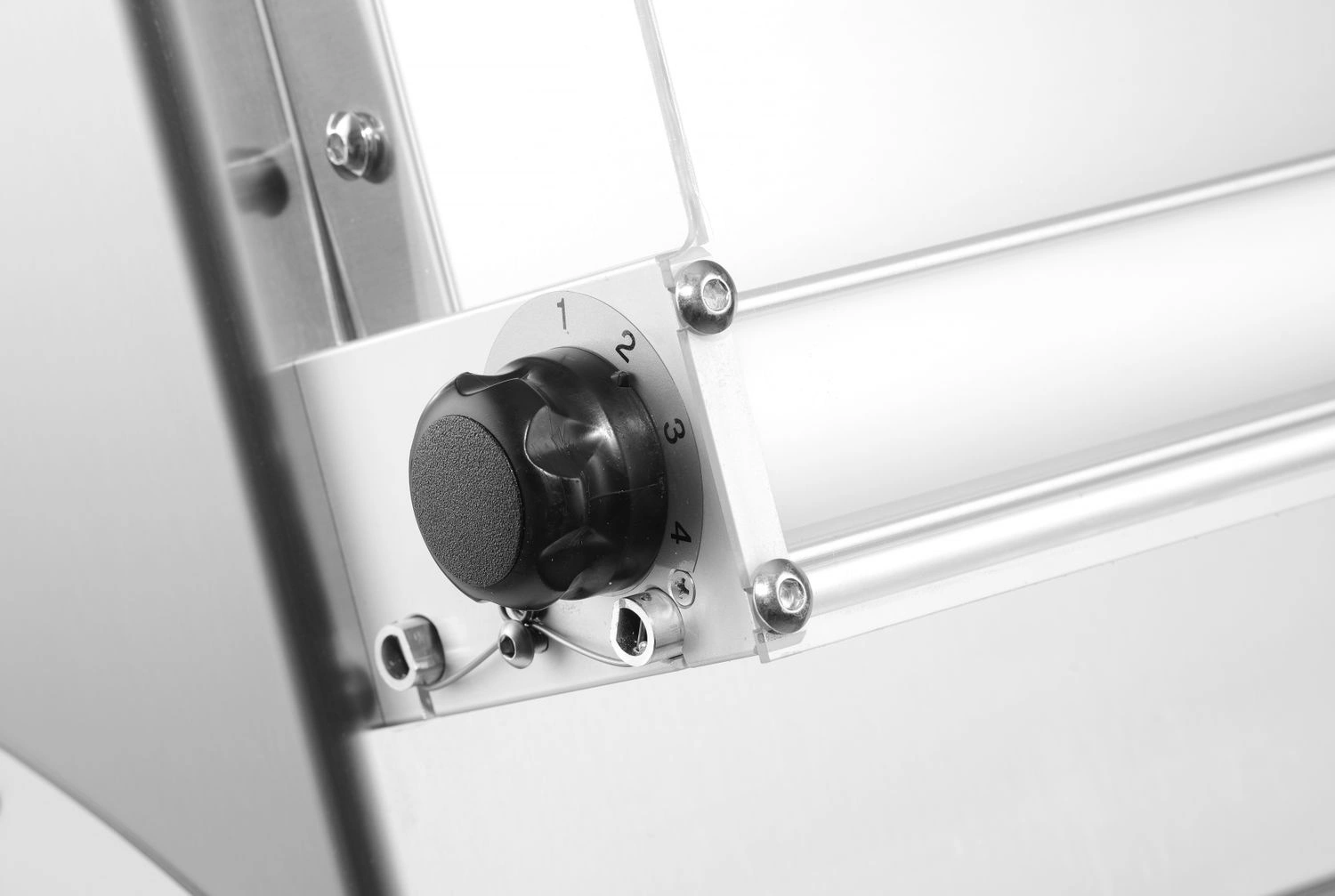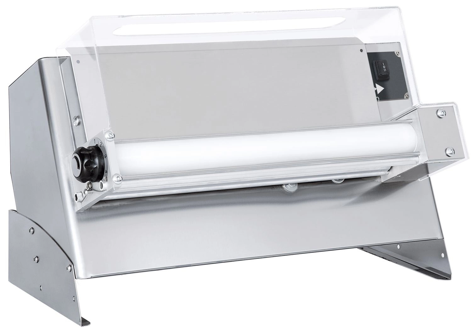 Elektrický stroj na tvarování pizzy (válcovací stroj) Vyrobeno z nerezové oceli. Elektrický nožní pedál. Spotřebič ideální pro válení studeného těsta na pizzu, knedlíky a těstoviny. Spotřebič má automatický spínač "touch and go", díky němuž se váleček automaticky zapne po vložení těsta. Provozní dobu lze nastavit v rozmezí 10-35 sekund. Válečky s nastavitelnou tloušťkou těsta 0-5 mm. Každý váleček má samostatný kryt pro zvýšení bezpečnosti provozu. Lze tvarovat pizzy o průměru 26 až 45 cm. Stíněné válce pro bezpečný provoz. Příkon těsta: 0,21 až 0,7 kg.
