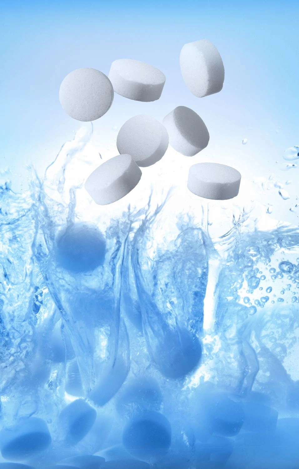 • Solné tablety s vysokou čistotou – vyrobené výhradně z chloridu sodného (NaCl), což zaručuje absenci nečistot a bezpečné použití v zařízeních na úpravu vody.