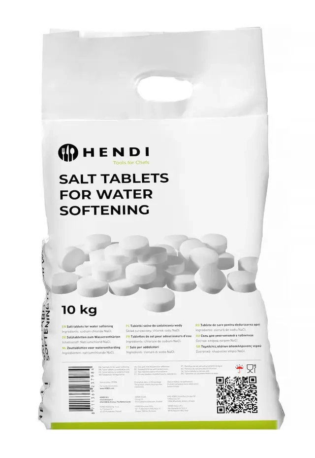 Balení obsahuje sůl ve formě tablet, vyrobenou výhradně z čistého chloridu sodného, bez chemických přísad a zbytečných nečistot. Produkt splňuje požadavky normy EN 973 Typ A, což potvrzuje jeho vysokou kvalitu a bezpečnost použití v různých typech zařízení. Sůl HENDI 237984 je volbou pro ty, kteří oceňují účinnost, pohodlí používání a ochranu zařízení před poškozením způsobeným tvrdou vodou. Díky vysoké čistotě a praktické formě tablet je produkt vhodný jak pro profesionální kuchyně, tak pro průmyslové instalace i domácí systémy na úpravu vody.