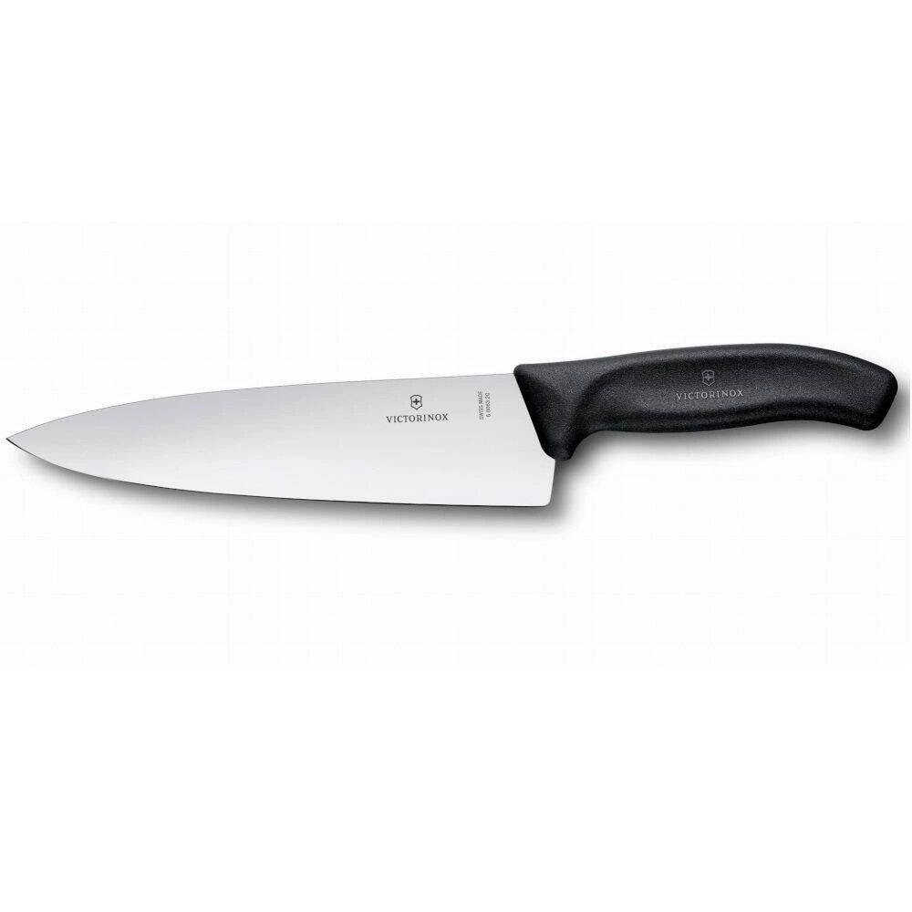 Nókuchařský nůž s černou rukojetí Victorinox. Skvěle se hodí do domácí i profesionální kuchyně. Vhodné pro všechny druhy masa, ovoce a zeleniny. Ideální pro krájení. Hladká čepel o délce 20 cm je vyrobena z válcované nerezové oceli se zvýšenou pevností, díky níž zůstává dlouho ostrá. Rukojeť nože je vyrobena z plastu (TPE) v černé barvě. Díky ergonomickému tvaru rukojeti nůž dobře sedí v ruce, což zvyšuje pohodlí. Lze jej mýt v myčce nádobí.