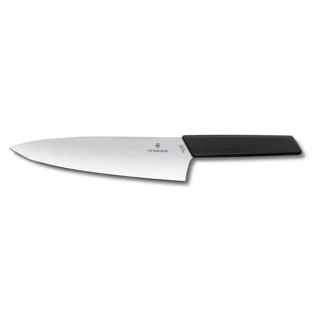 Kuchařský nóž s černou rukojetí od Victorinoxu. Je ideální pro krájení a porcování masa a uzenin. Bez námahy s ním nakrájíte i ovoce a zeleninu různé tvrdosti. Hladká a široká čepel o délce 20 cm je vyrobena z válcované nerezové oceli se zvýšenou odolností, díky níž si dlouho zachovává svou ostrost. Rukojeť nože je vyrobena z polypropylenu (PPC) v černé barvě. Ergonomický tvar rukojeti znamená, že nůž dobře sedí v ruce, což zvyšuje pohodlí. Celková délka nože je 34,5 cm. Nóy lze mýt v myčce nádobí.