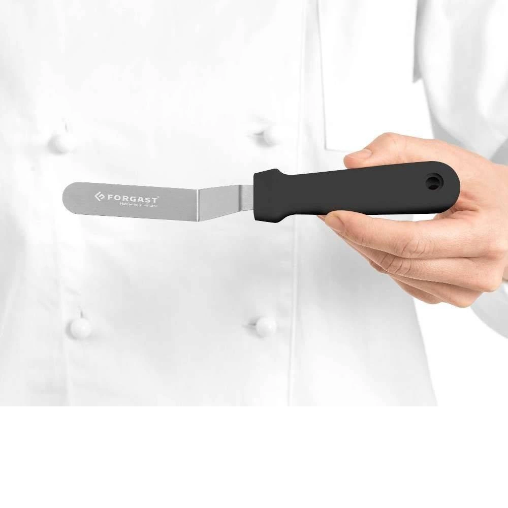 Úhlová špachtle FORGAST FG11207 byla navržena s ohledem na pohodlí a přesnost. Její úzká, mírně zahnutá špička umožňuje volnou práci jak na rovných plochách, tak v těžko přístupných místech. Skvěle se hodí pro nanášení a uhlazování krémů na dortech, přípravu vrstvených dezertů nebo práci s čokoládou. Díky vhodné délce a tvarování je tento nástroj nenahraditelný v profesionálních cukrářských dílnách i v domácích kuchyních, kde záleží na estetice a preciznosti provedení.