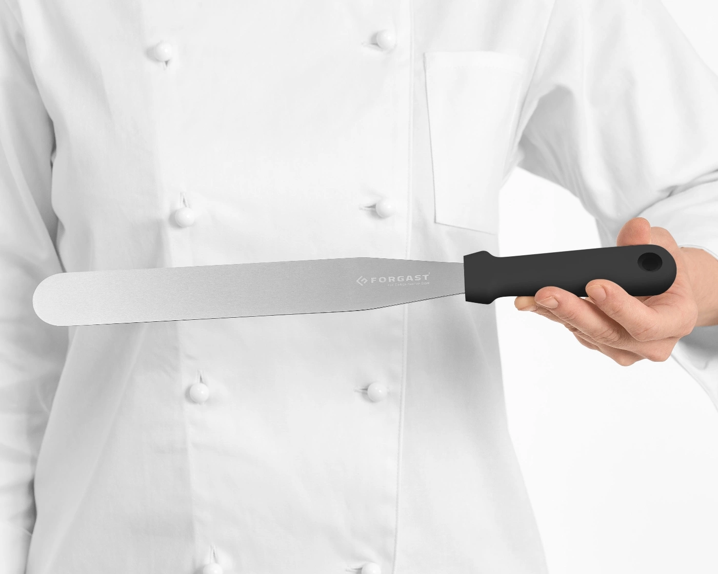 Úzká cukrářská stěrka na dorty FORGAST FG11209 je profesionální cukrářský nástroj, který najde uplatnění jak v cukrářských dílnách, tak i v domácí kuchyni. Vyznačuje se pevnou konstrukcí a ergonomickým tvarem, což ji činí ideální pro přesné roztírání hmot, krémů a dekorací na povrchu pečiva. Malá šířka umožňuje dokonalé dokončení i těch nejmenších detailů.