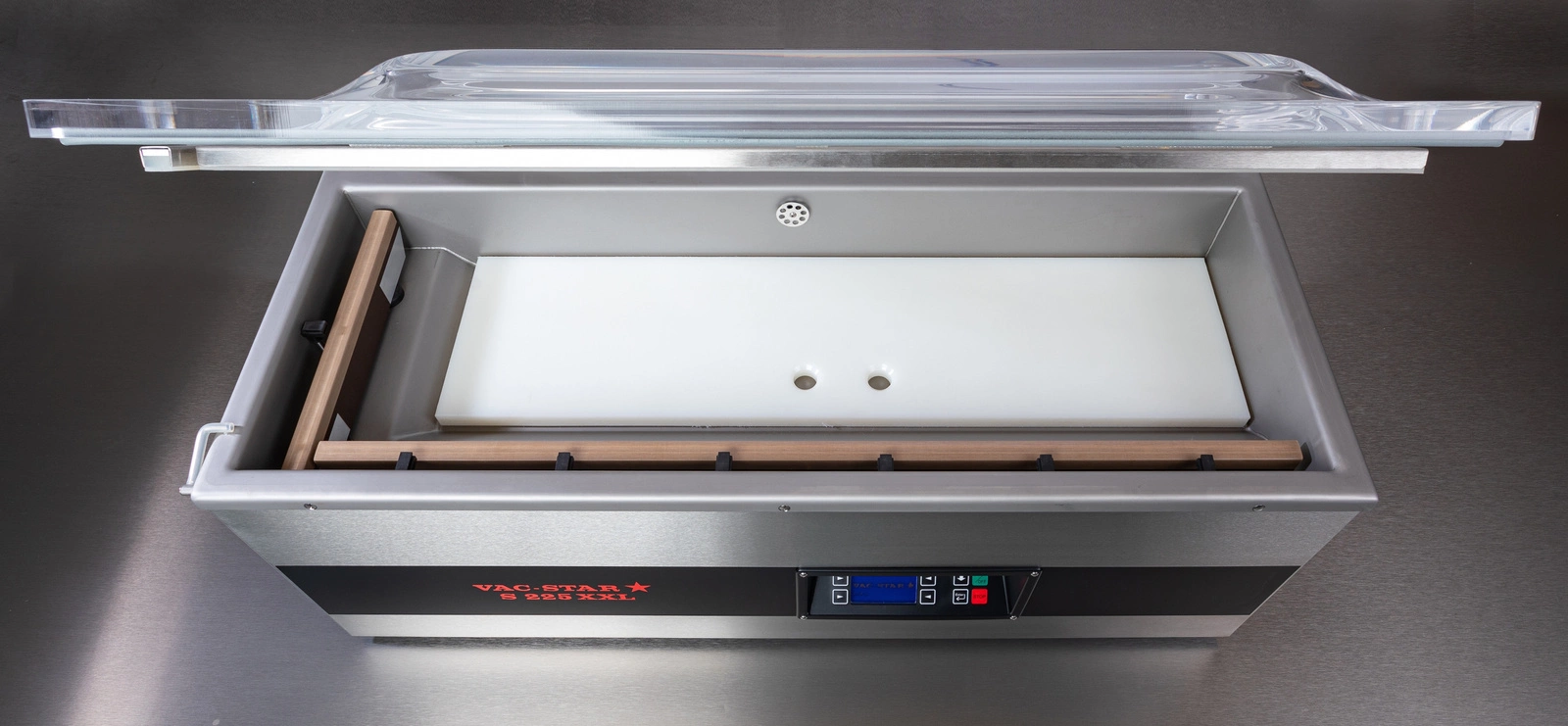 Model S 225-XXL SX je vybaven prostornou komorou o rozměrech 950 × 330 × 160 mm, která umožňuje balit výrobky o maximální velikosti sáčku 280 × 950 mm. Průhledné víko z PMMA (plexiskla) podepřené plynovými pružinami zajišťuje plný přehled o procesu balení. Dvě těsnicí tyče o délce 280 mm (vlevo) a 890 mm (vpředu) umožňují pohodlně a pevně uzavřít i extrémně dlouhé výrobky. Standardní výbava zahrnuje 3 bílé polyethylenové vložky a speciální vložku na kapaliny, díky čemuž je stroj mimořádně všestranný.