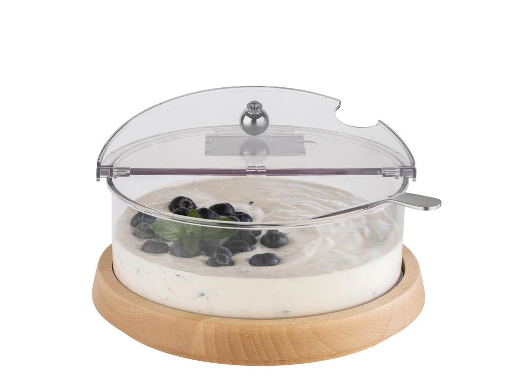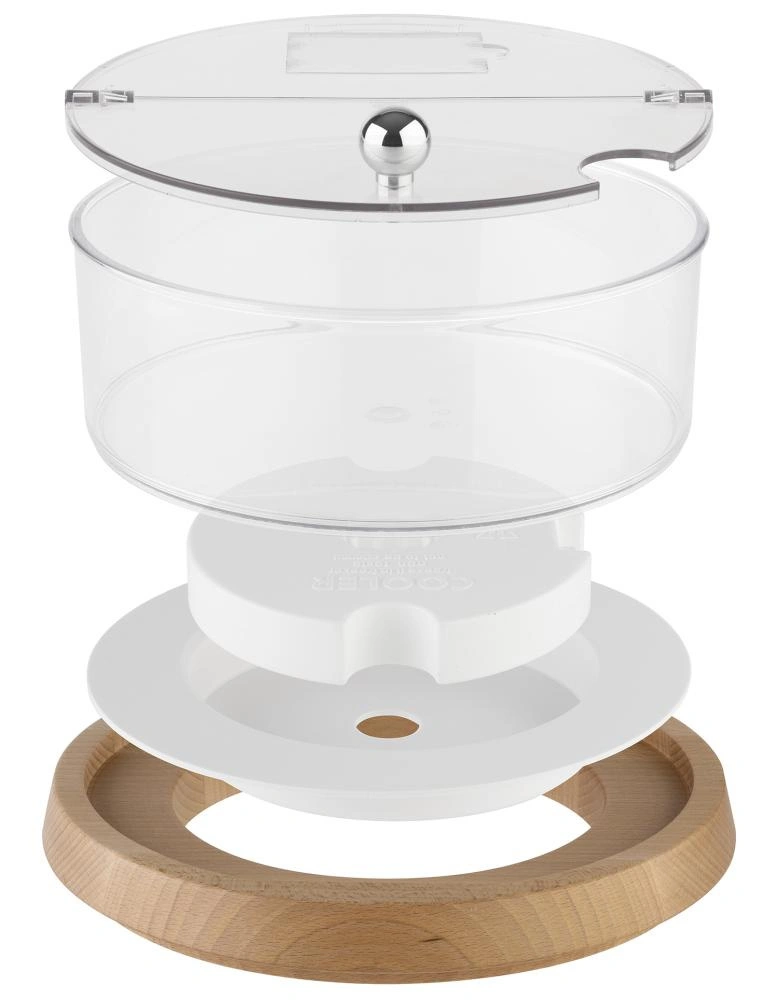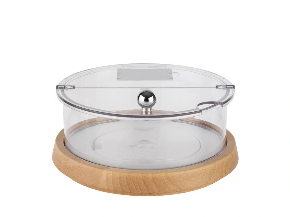 Součástí produktu je průhledná mísa vyrobená z odolného plastu, lakovaná základna z bukového dřeva, praktická chladicí vložka a výklopné víko s místem pro popis pokrmu. Každý z těchto prvků byl navržen s důrazem na snadné používání a pohodlí jak pro obsluhu, tak pro hosty.
