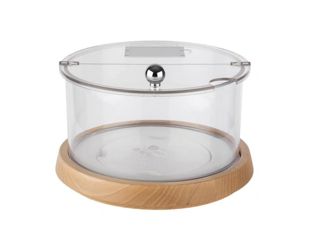 Mísa se skládá z průhledné nádoby z plastu, stabilního podstavce z lakovaného bukového dřeva, praktické chladicí vložky a výklopného víka s místem pro popis. Díky této konstrukci je produkt pohodlný na obsluhu, snadno se čistí a umožňuje bezpečné uchovávání jídla.