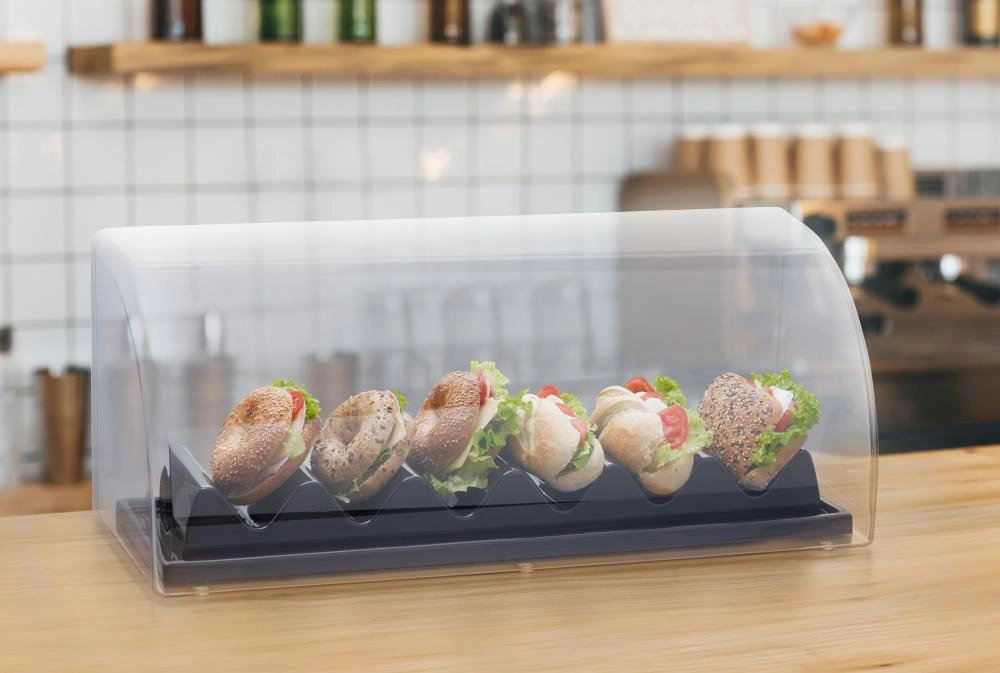 Vitrína na sendviče nebo hot dogy je praktický a estetický bufetový stojan, který je ideální pro gastronomická zařízení, bufety, kavárny nebo při akcích. Je vyrobena z odolného a průhledného materiálu SAN, což zaručuje její pevnost a atraktivní prezentaci produktů. Její kompaktní rozměry umožňují pohodlné umístění na pult nebo stůl a protiskluzová plocha zajišťuje bezpečnost při používání.