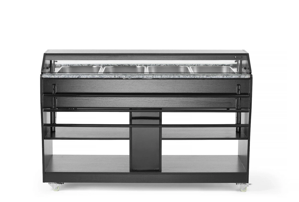 Vitrína, vyhřívaný bufet HENDI 274064 je profesionální gastronomické zařízení určené k udržování teploty pokrmů a jejich estetické prezentaci. Zařízení se vyznačuje kombinací robustní konstrukce z nerezové oceli a černé dřevěné překližky a také možností mobilního použití díky kolečkům. Ideální pro samoobslužné restaurace, catering i akce, kde je důležitý komfort obsluhy a efektní prezentace jídel.