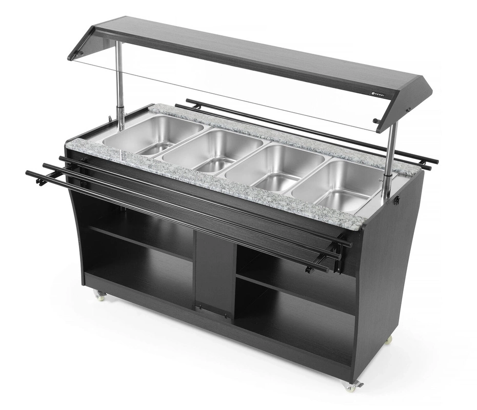 Vyhřívaný bufet HENDI spojuje moderní vzhled s praktickými řešeními určenými pro gastronomii. Vestavěné osvětlení v horní části zajišťuje skvělou viditelnost pokrmů i v méně osvětlených prostorách. Ochranný kryt lze sklopit a zajistit pomocí západek, což zvyšuje bezpečnost a hygienu během servírování jídel. Další police pod pultem umožňují pohodlné uložení talířů a příborů, zatímco vodítka po stranách zajišťují efektivní obsluhu i při velkém provozu.