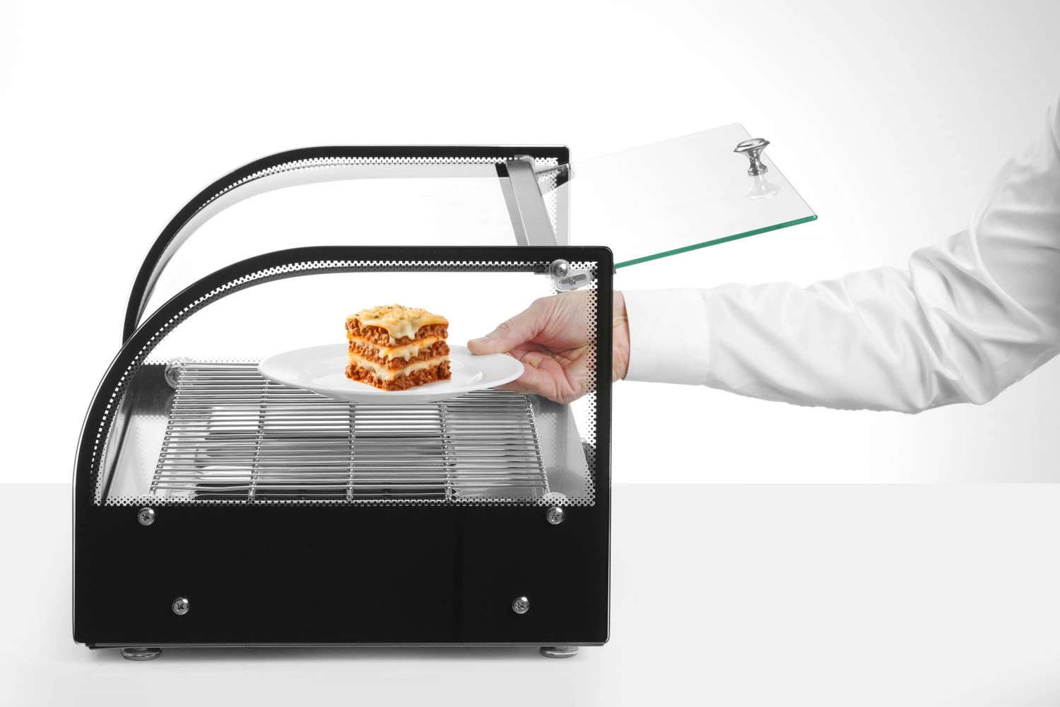 Ohřívací vitrína HENDI 273982 je profesionální zařízení určené k prezentaci a udržování teploty hotových pokrmů. Vyznačuje se pevnou konstrukcí z tvrzeného skla a nerezovým krytem, což zajišťuje trvanlivost a estetický vzhled. Zařízení je ideální pro gastronomické provozovny, kavárny nebo pekárny, kde je důležitá jak expozice, tak udržení správné teploty servírovaných produktů.