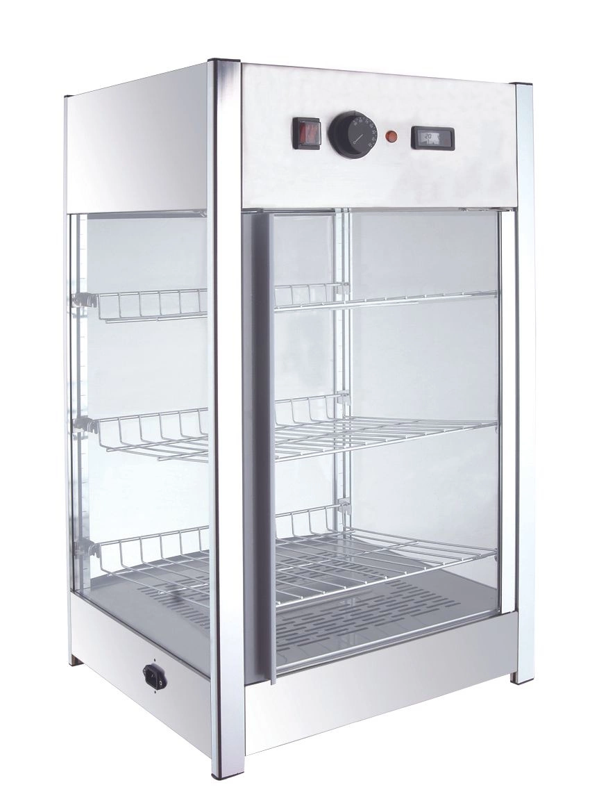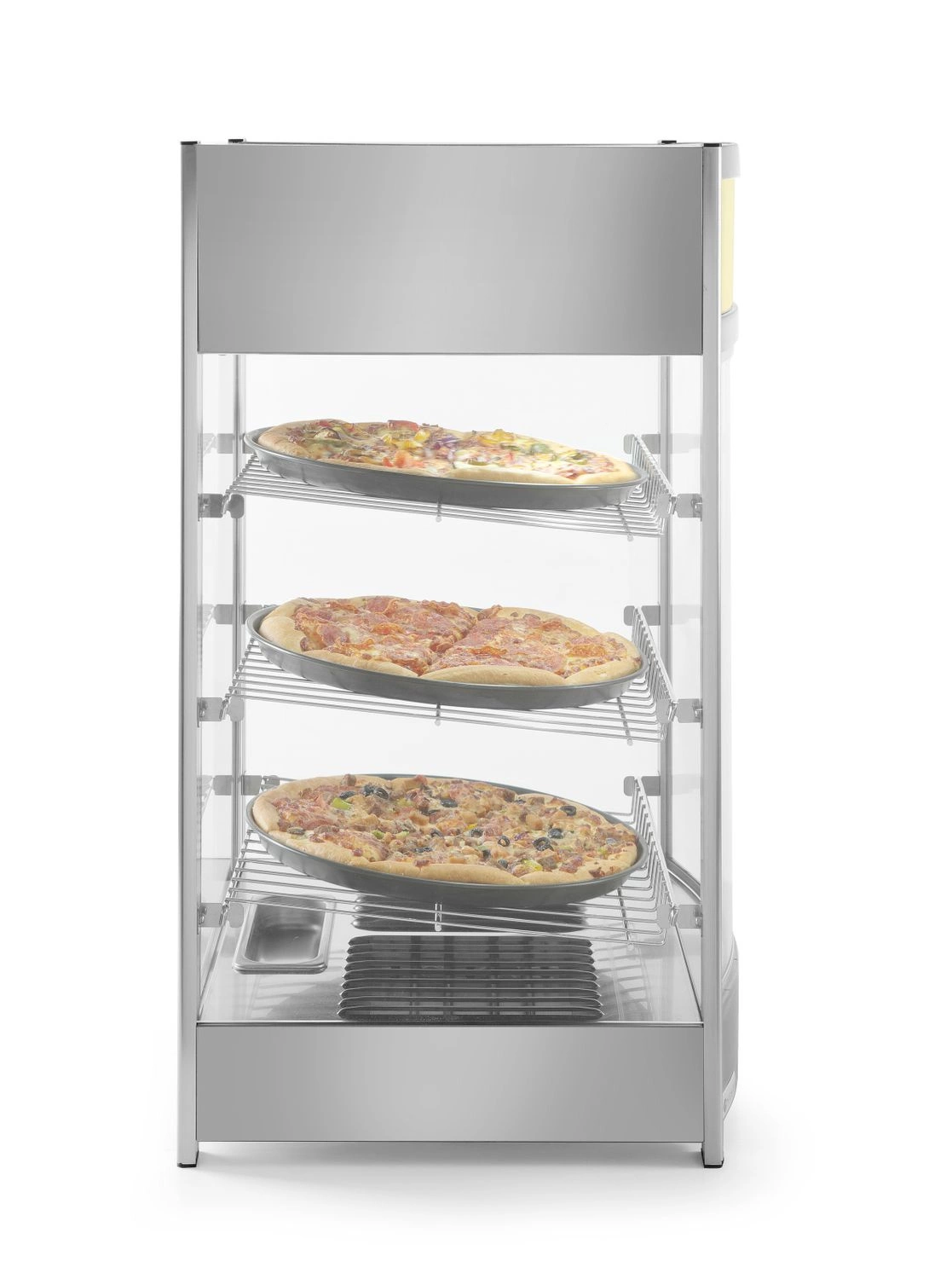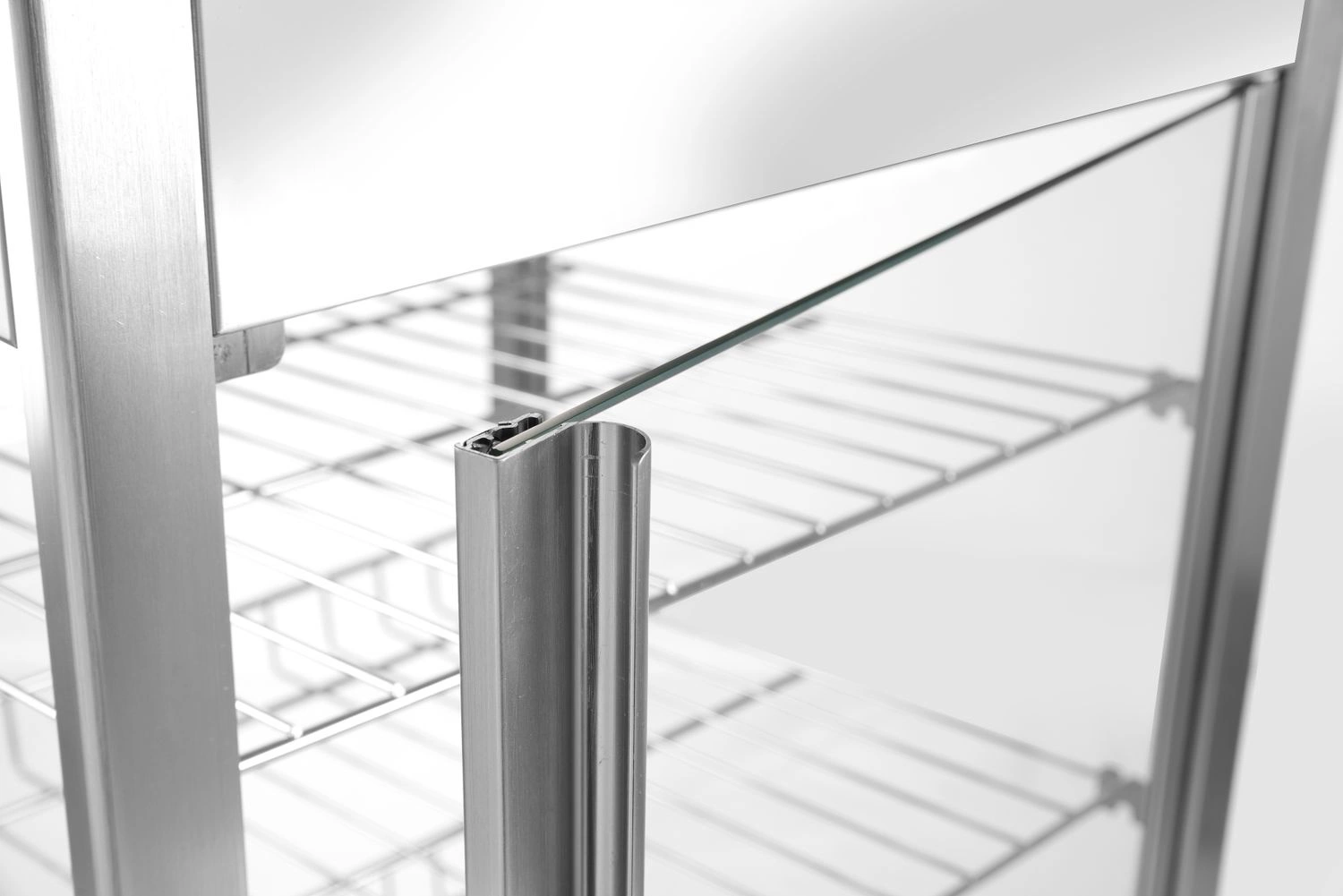 Vitrína je vybavena třemi policemi o rozměrech 40 x 33,5 cm, jejichž výšku lze nastavit po 2 cm, což umožňuje flexibilní uspořádání produktů různých velikostí. Horní osvětlení zajišťuje výbornou expozici uchovávaných jídel, což podporuje zvýšení prodeje a přitahuje pozornost zákazníků. Uživatelsky přívětivý analogový teploměr a praktický otočný knoflík umožňují snadné sledování a regulaci teploty. Zadní křídlové dveře zajišťují rychlý přístup do vnitřku zařízení, zatímco zaoblené přední sklo podtrhuje moderní design a usnadňuje prezentaci gastronomické nabídky.