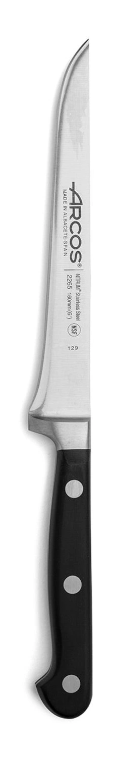 Vykosťovací nůž ze série ÓPERA od společnosti Arcos je přesný nástroj, který díky tenké a úzké čepeli usnadňuje oddělování masa od kostí. Tento nůž je vyroben ve Španělsku a má čepel z inovativní nerezové oceli NITRUM®, která poskytuje zvýšenou tvrdost a odolnost proti korozi. Ostří hedvábného ostří zaručuje mimořádně hladké a přesné řezy, díky čemuž je tento nůž ideální pro přesné kuchyňské práce, jako je například vykosťování masa. Čepel je vykovaná z jednoho kusu oceli pro větší pevnost a stabilitu. Dokonale vyvážená rukojeť z odolného materiálu POM, spojená se střenkou nýty z nerezové oceli, zaručuje bezpečné a pohodlné držení při používání. Profil chránící prsty dále zvyšuje bezpečnost při práci.