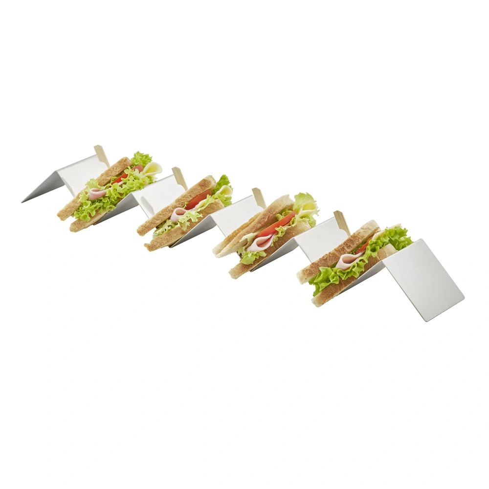 Prezentační stojan na 4 sendviče nebo burgery je praktickým a estetickým prvkem vybavení bufetů, restaurací a kaváren. Výrobek z nerezové oceli se vyznačuje vysokou odolností a moderním designem. Díky čtyřem tvarovaným přihrádkám umožňuje pohodlnou prezentaci a servírování sendvičů nebo burgerů atraktivním způsobem pro hosty.