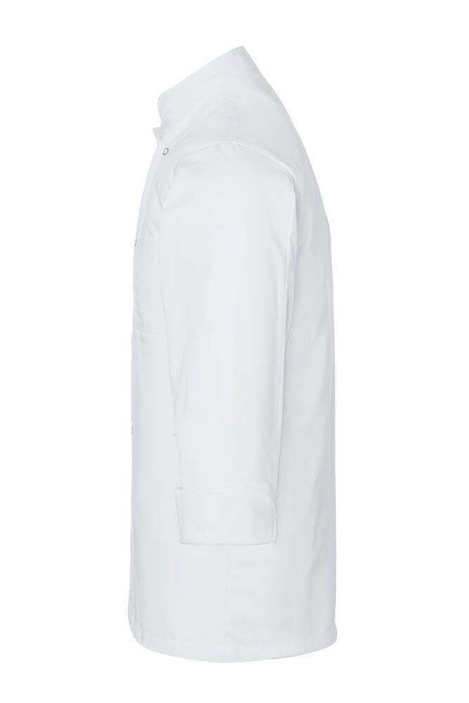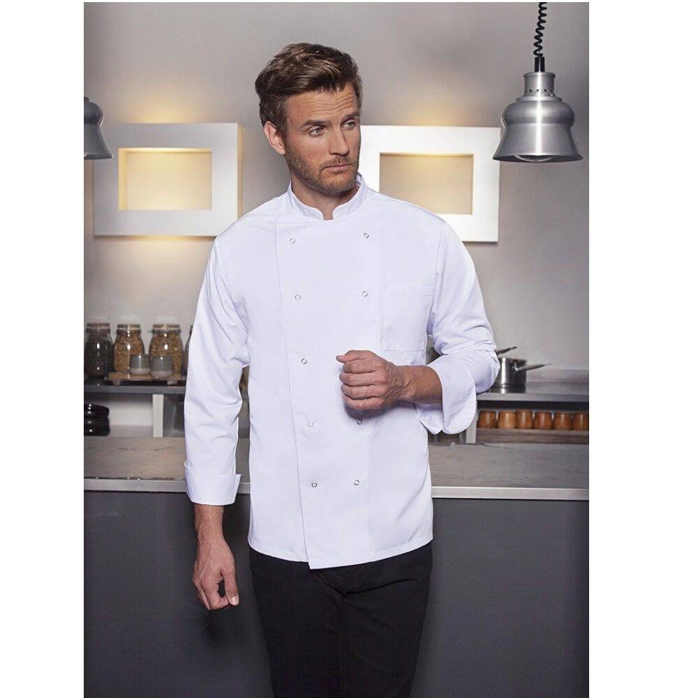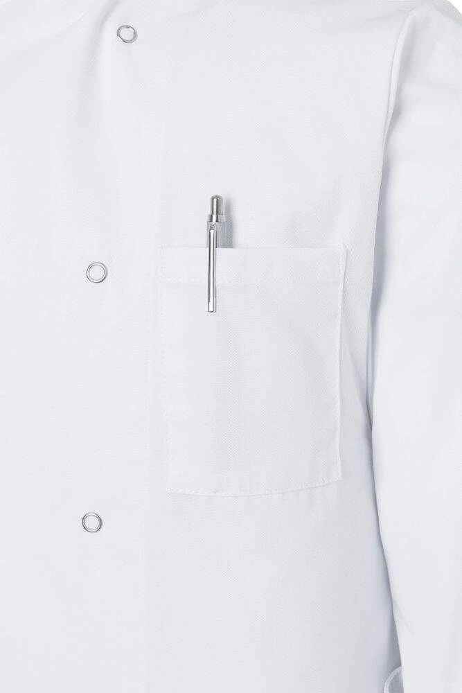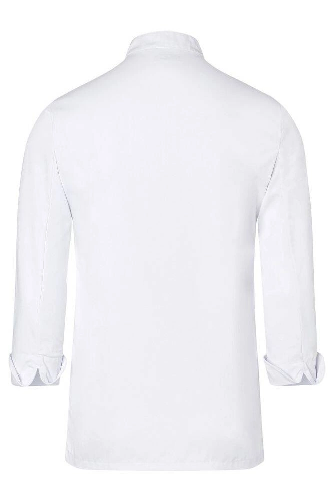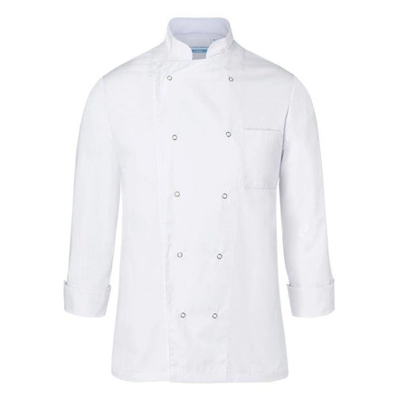 Základní pánská mikina pro kuchaře od společnosti Karlowsky. Bílá barva. Vyrobeno z 35 % bavlny a 65 % polyesteru. Keprová vazba. Mikina má pravidelný spodní lem a manžety s rozparkem. Kapsa na hrudi na levé straně. Dvouřadá blůza s 10 bílými knoflíky a 10 patentkami. Lze prát v pračce a žehlit. Nesušit v sušičce ani nebělit. Dostupné velikosti od XS do 3XL