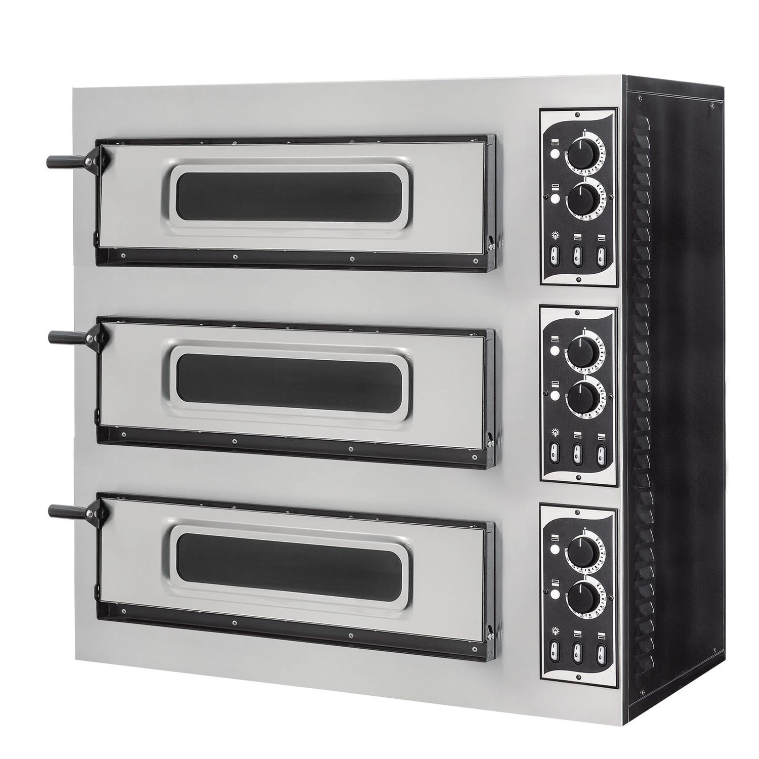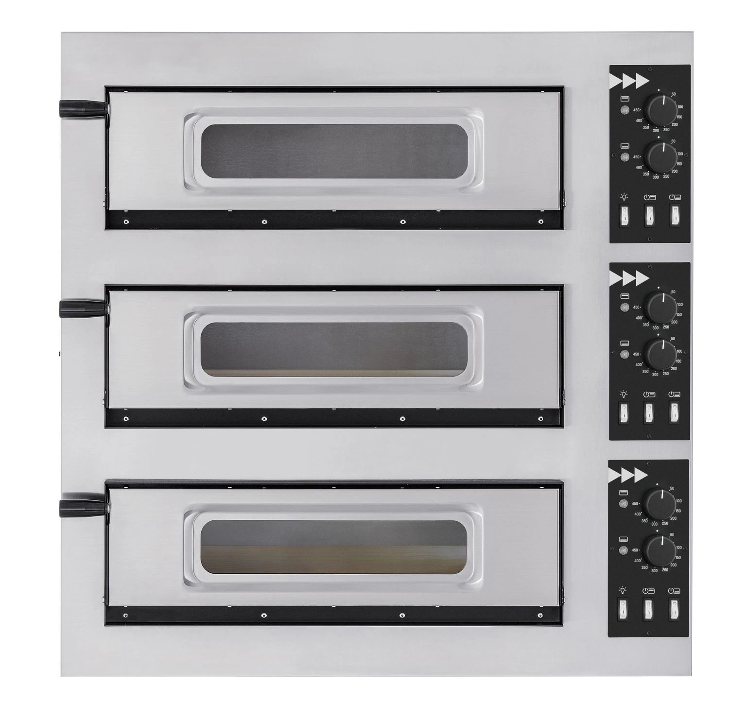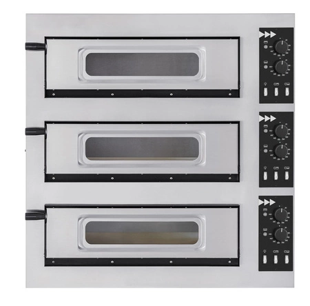 Elektrická tříkomorová pec na pizzu od společnosti Prismafood. Může současně péct až 3 plechy pizzy o rozměrech 60x40 cm nebo 3 pizzy o průměru 45 cm nebo větší počet menších pizz. Pec je ideální pro velké pizzerie. Teplotní rozsah spotřebiče je 45 až 455°C. Samostatné manuální ovládání pro každou komoru. Na ovládacím panelu jsou samostatné knoflíky pro ovládání teploty horního a spodního ohřevu. K dispozici jsou 3 přepínače pro zapnutí osvětlení komory, pouze spodního topného tělesa nebo pouze horního topného tělesa. Dno komory trouby je vyloženo šamotovým kamenem pro rychlý a rovnoměrný ohřev komory. Prosklená dvířka každé komoryór umožňují sledovat průběh pečení. Plášť trouby je vyroben z černě lakované oceli, čelo a dvířka z nerezové oceli.