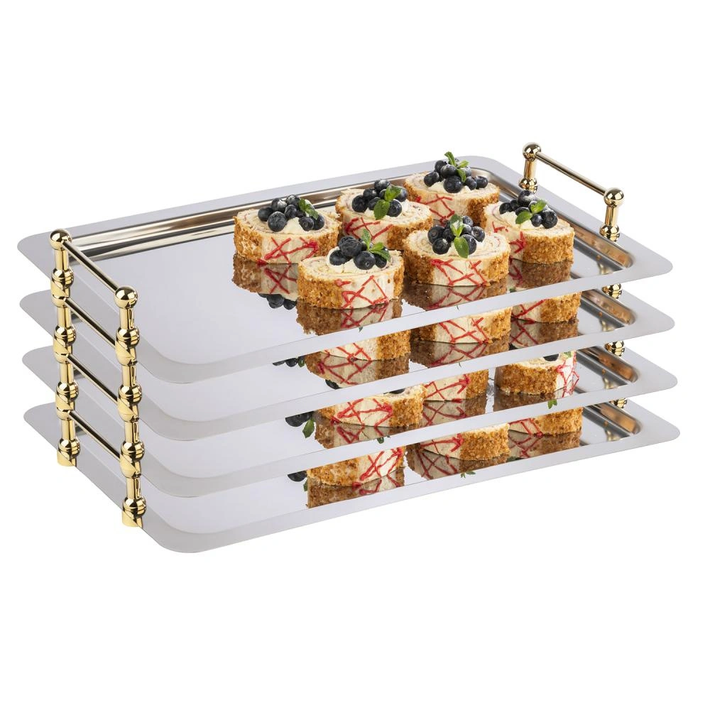 Výrobek je vyroben z vysoce kvalitní nerezové oceli 18/10, což zaručuje odolnost vůči vnějším vlivům a intenzivnímu používání. Pozlacené úchyty jsou pevně připevněny a celek se vyznačuje estetickým zpracováním. Díky vhodné hloubce a rozměrům tác umožňuje prezentaci různých druhů jídel, od předkrmů po dezerty. Hladký povrch se snadno udržuje v čistotě a univerzální vzhled se hodí do každého interiéru.