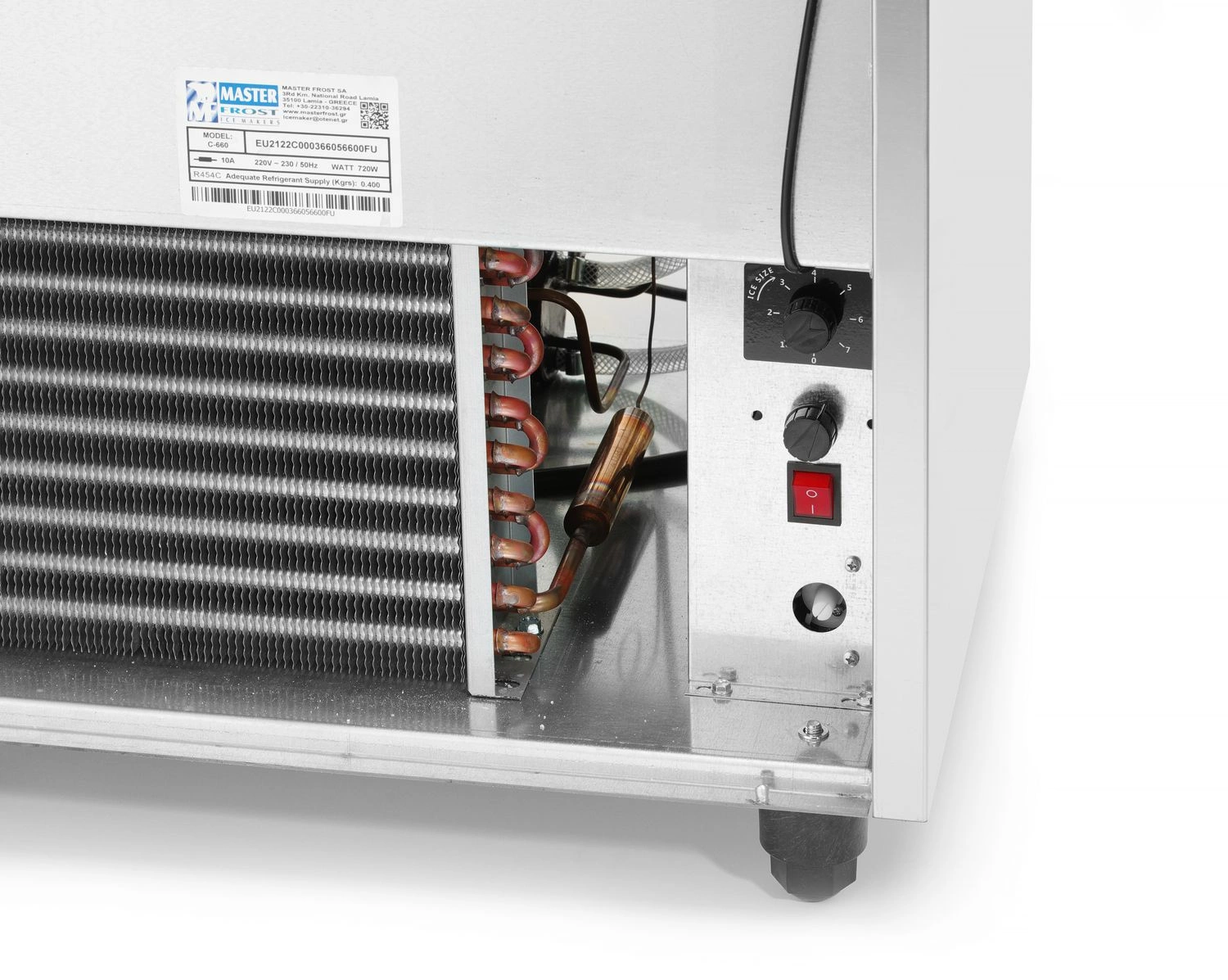 Výrobník kostek ledu Hendi Master Frost s kapacitou 65 kg/den. Plášť jednotky je vyroben z kyselinovzdorné oceli AISI 304, která zajišťuje dlouhou životnost a odolnost proti korozi. Při výrobě kostek je použit inovativní systém Interní chlazení(využívá teplo z kompresoru, který se zahřívá), což znamená, že výrobník kostek ledu spotřebuje při výrobě kostek ledu méně elektřiny. Kostky ledu jsou vyráběny pomocí technologie rozprašování, díky níž je každá kostka ledu průhledná. Kostky mají šestihranný otvorór, který zvyšuje chladicí výkon nápoje. Systém Klikněte na usnadňuje čištění spotřebiče a udržuje ho hygienicky čistý během několika sekund. Přístroj účinně funguje i při teplotách do 42 stupňůVýrobník kostek ledu je tak vhodný i pro sezónní použití. Umístění větracích otvorů v přední části přístroje umožňuje instalaci výrobníku kostek pod pracovní desku. Nožičky přístroje jsou výškově nastavitelné. Zásobník má kapacitu až 35 kg.
