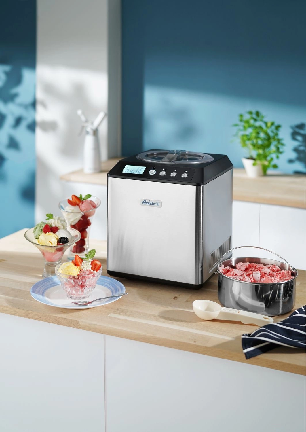 V přístroji lze mimo jiné připravovat také sorbety a mražené jogurty. Stroj je vybaven nádobou na zmrzlinu o objemu 2 l. Vzduchem chlazený kompresor s teplotním rozsahem od -10°C do -35°C. Podsvícený digitální displej (zobrazuje mimo jiné provozní dobu a teplotu mražení). Míchací lopatka v nádobě. Průhledné víko s pohodlným uzavíracím systémem typu „Twist-Lock”.